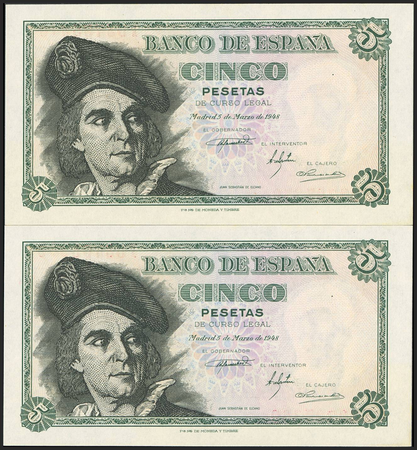 5 Pesetas. 5 de Marzo de 1948. Pareja correlativa. Serie I. (Edifil 2023: 455a). Apresto original. SC.