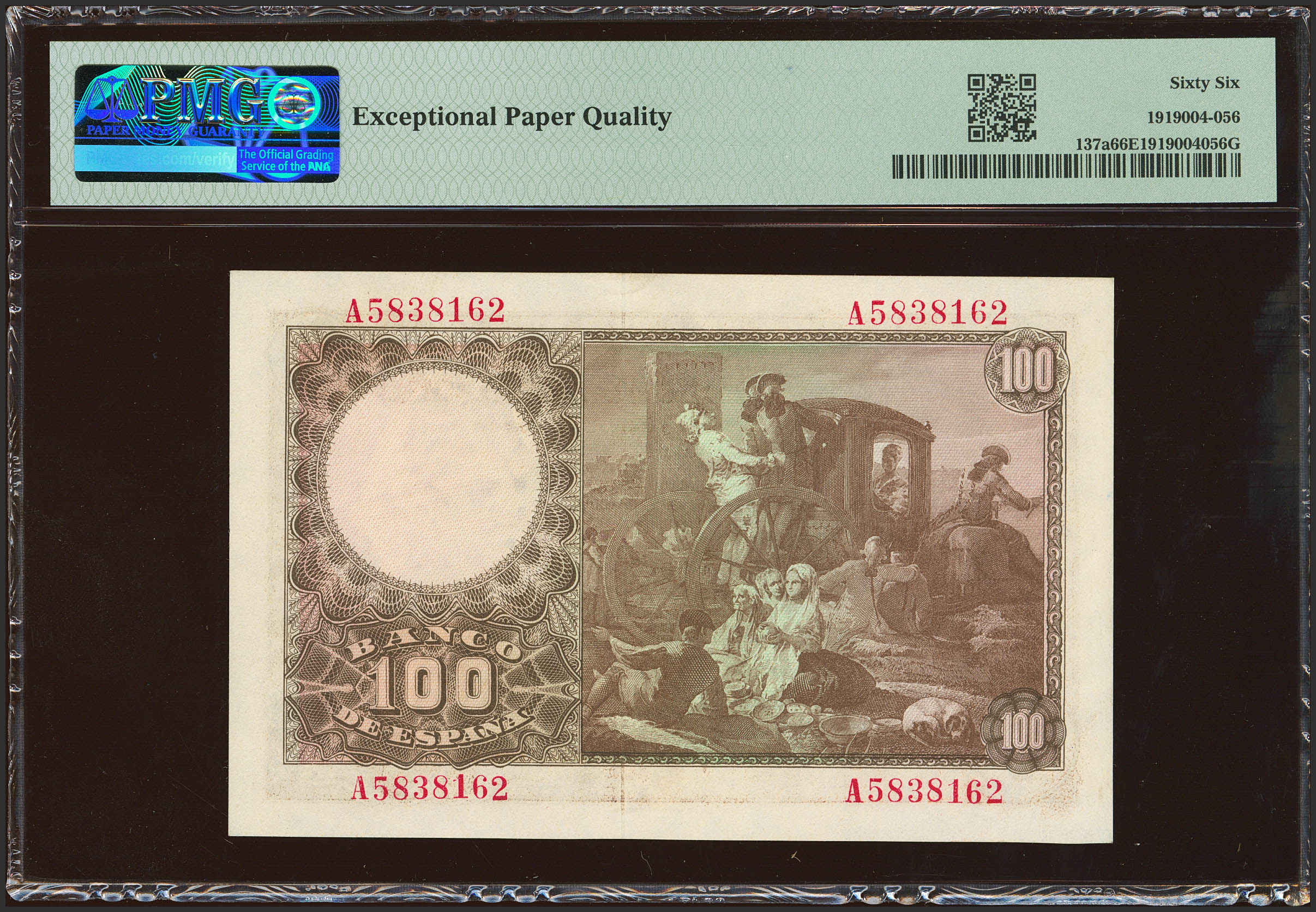 100 Pesetas. 2 de Mayo de 1948. Serie A. (Edifil 2023: 456a, Pick: 137a). Inusual en esta excepcional calidad, apresto original. SC. Encapsulado PMG66EPQ.