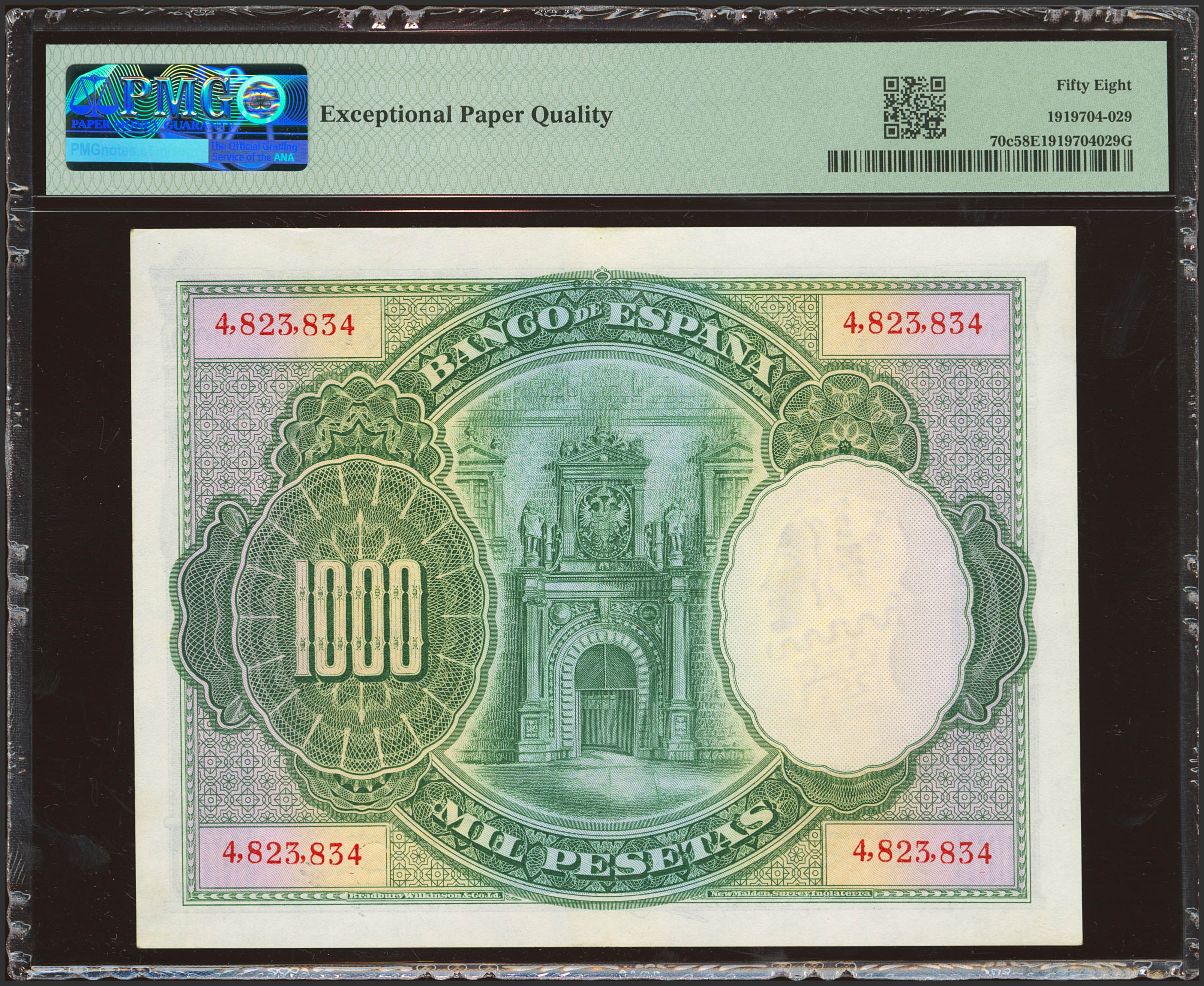 1000 Pesetas. 1 de Julio de 1925. Sin serie y numeración superior al 3646000. (Edifil 2023: 351, Pick: 70c). Inusual en esta calidad, apresto original. EBC+++. Encapsulado PMG58EPQ.