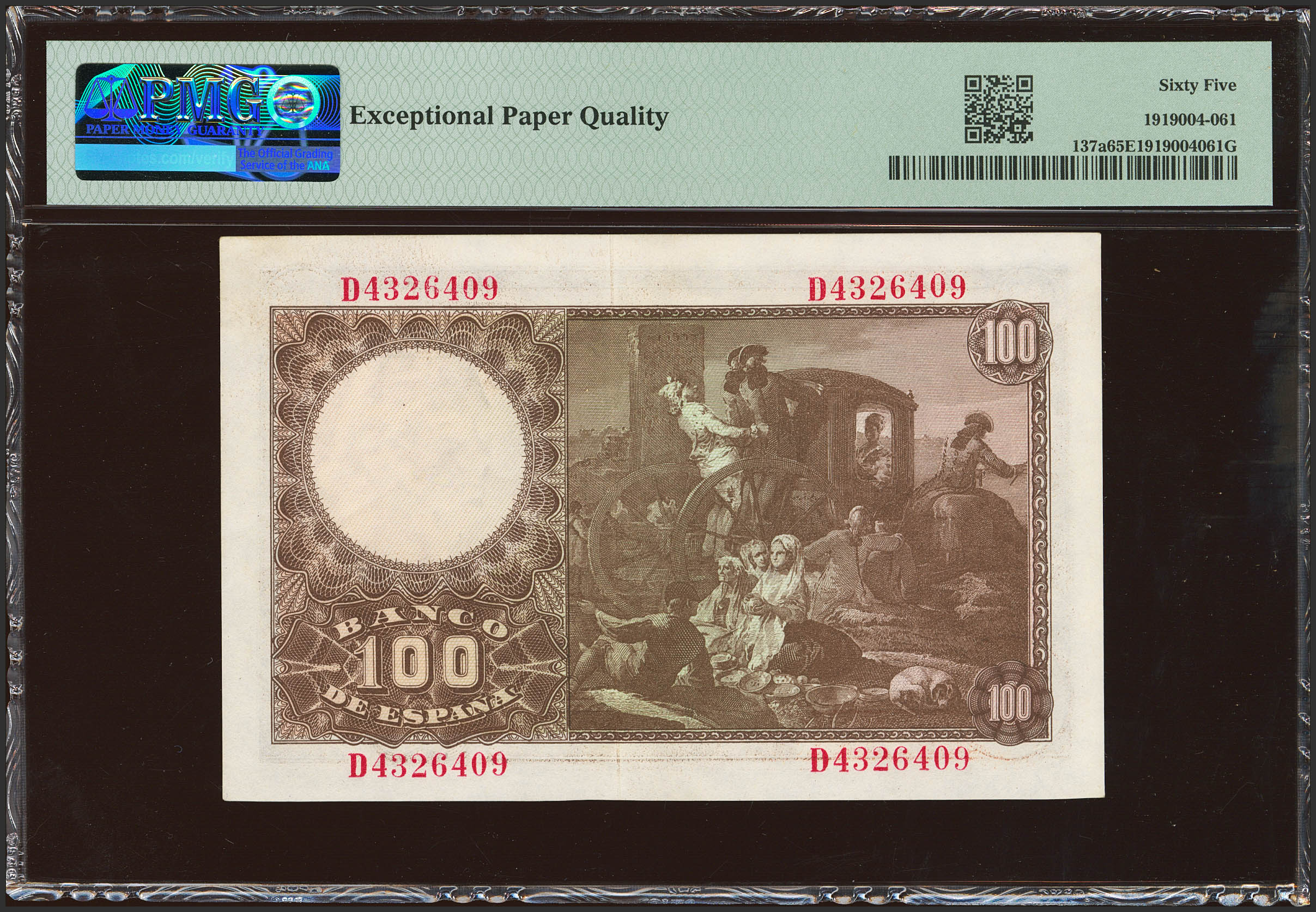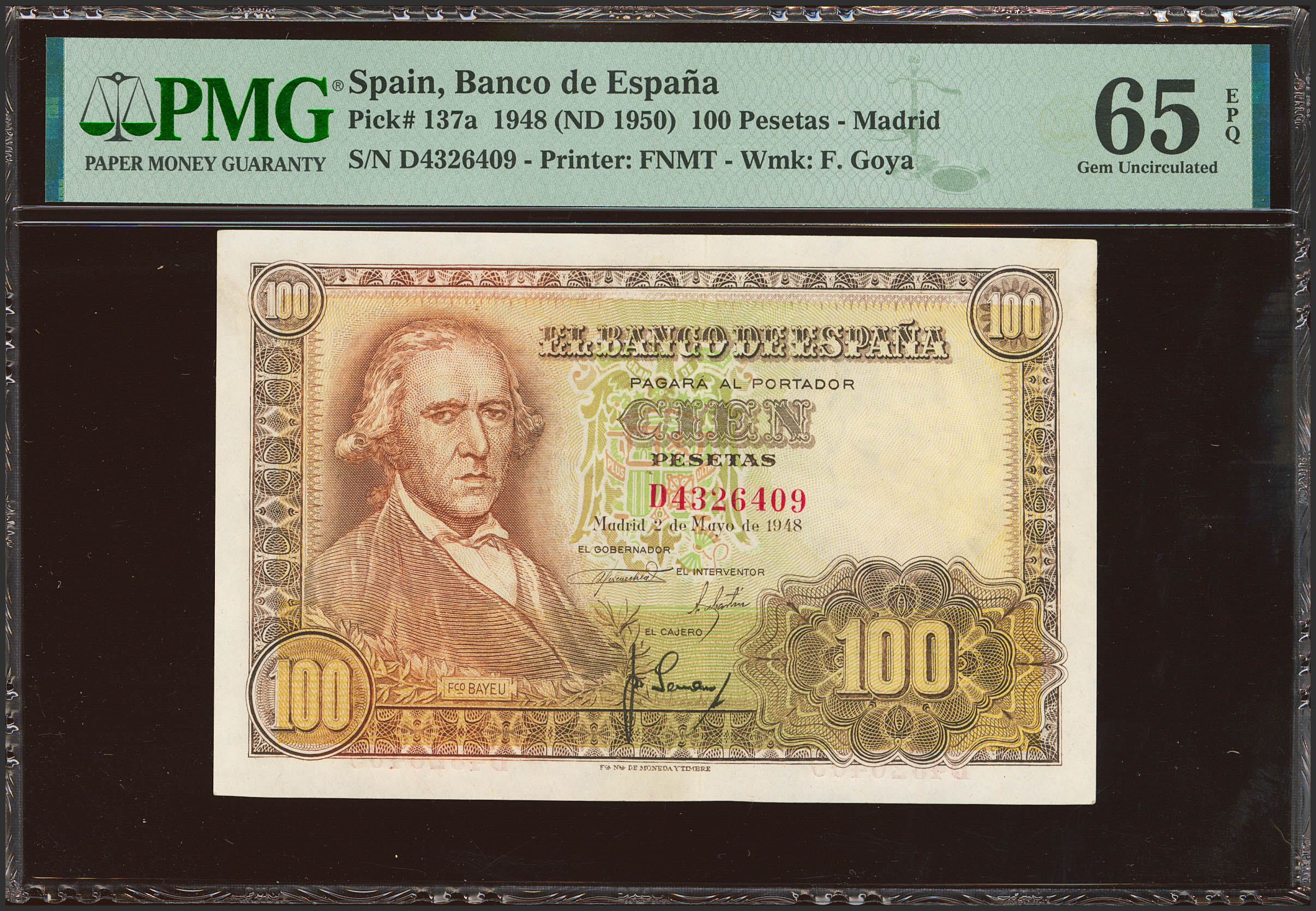 100 Pesetas. 2 de Mayo de 1948. Serie D. (Edifil 2023: 456a, Pick: 137a). Inusual en esta excepcional calidad, apresto original. SC. Encapsulado PMG65EPQ.