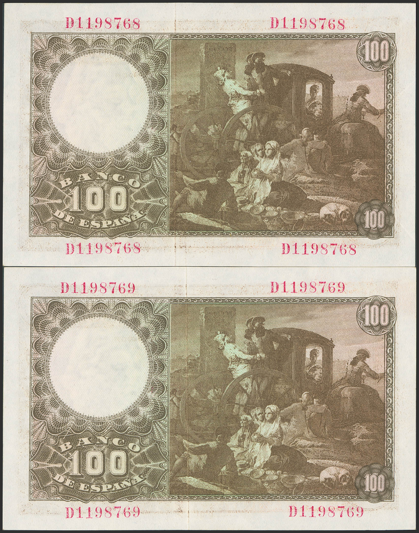 100 Pesetas. 2 de Mayo de 1948. Pareja correlativa. Serie D. (Edifil 2023: 456a). Apresto original. EBC+++.