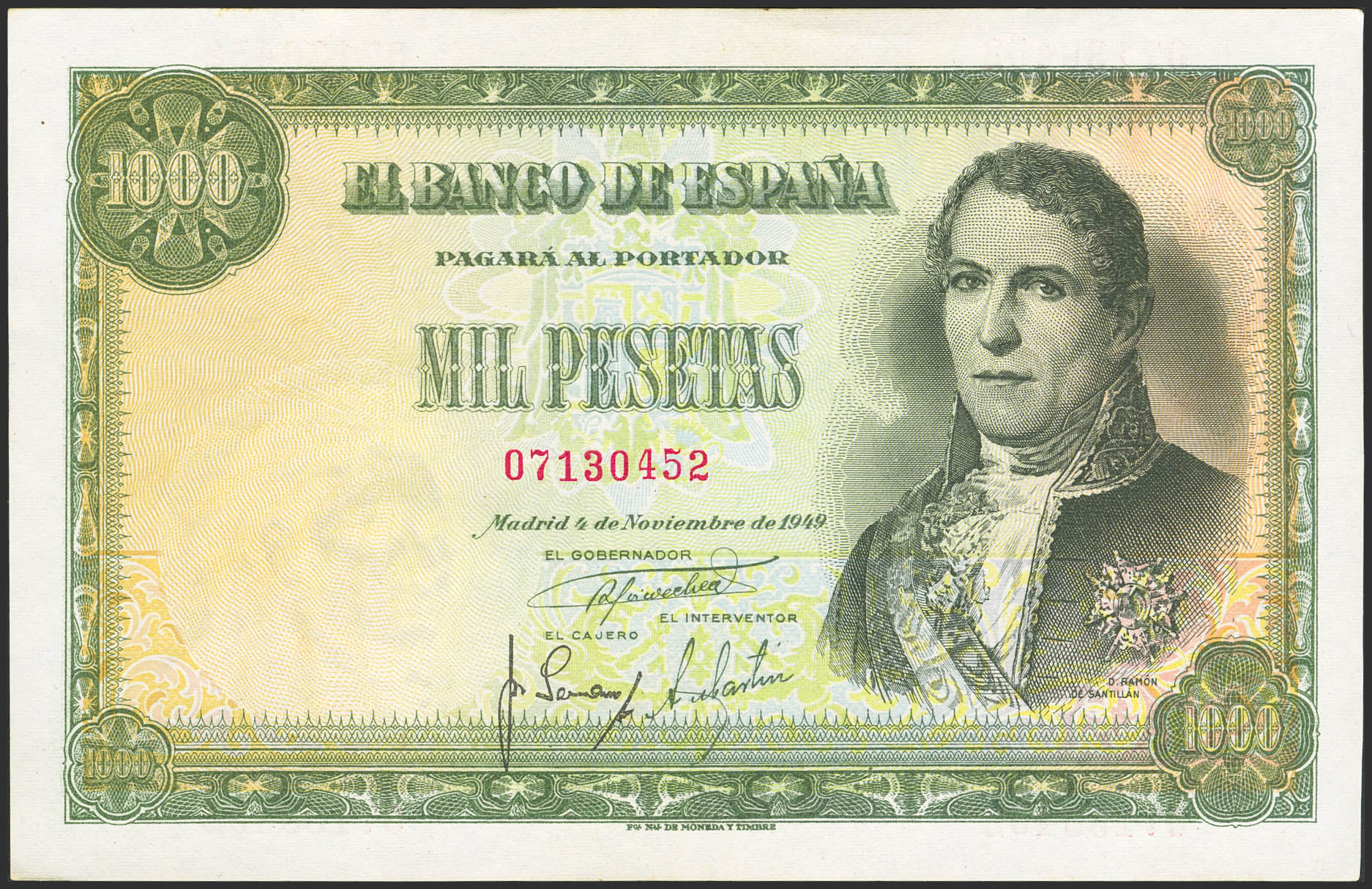 1000 Pesetas. 4 de Noviembre de 1949. Sin serie. (Edifil 2023: 458). Conserva parte del apresto original. EBC+.
