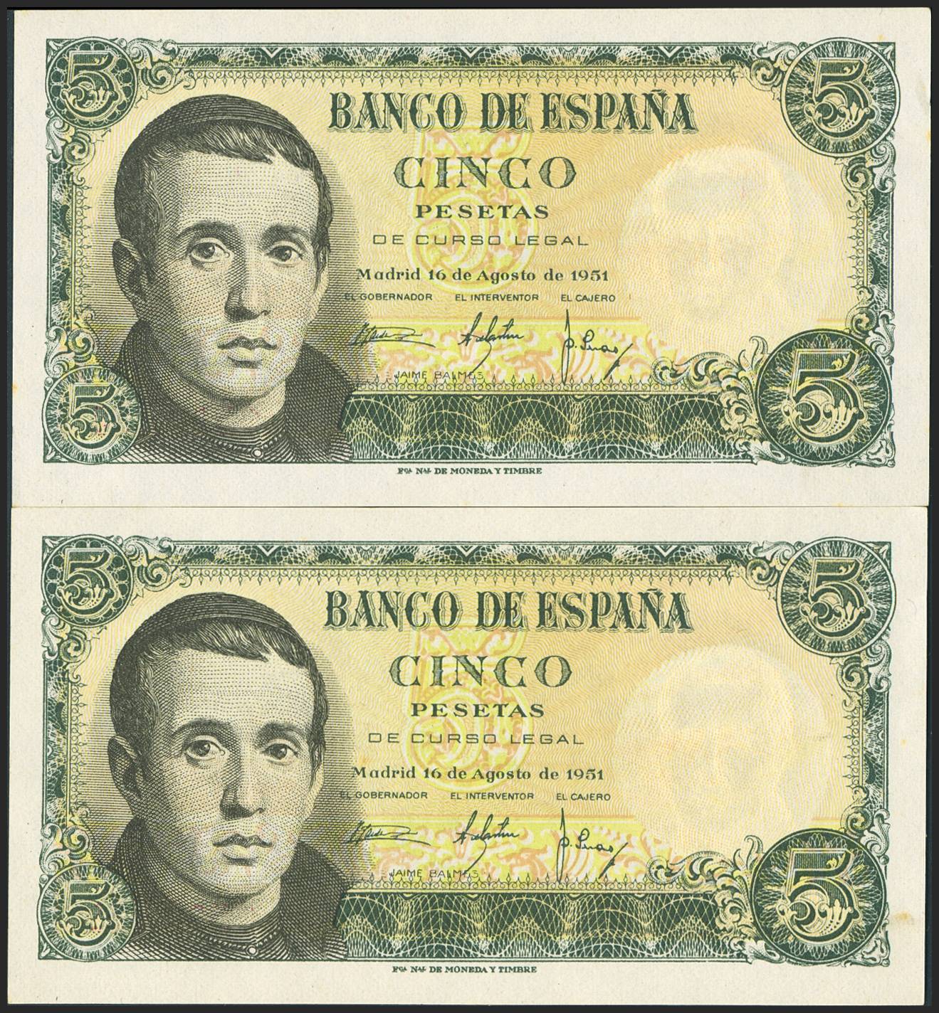5 Pesetas. 16 de Agosto de 1951. Pareja correlativa. Sin serie. (Edifil 2023: 459). Apresto original. SC-.