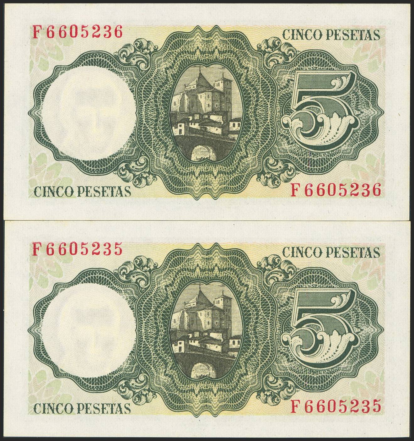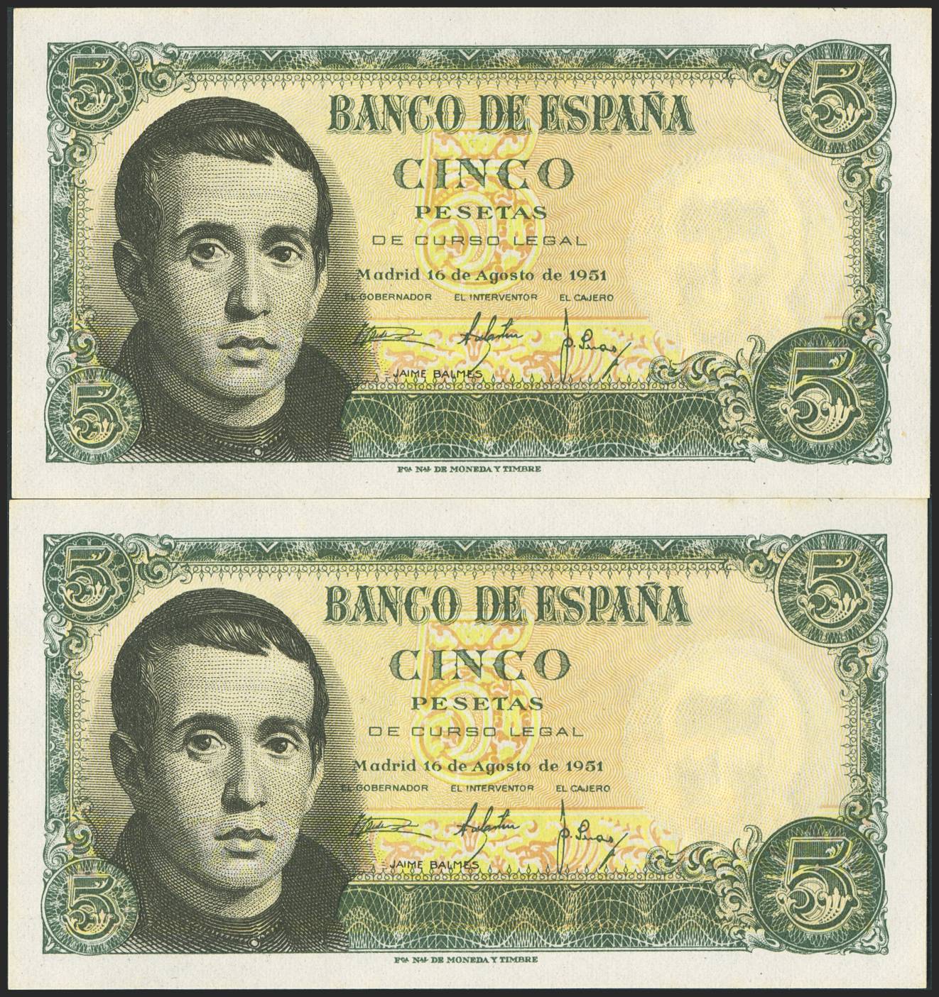 5 Pesetas. 16 de agosto de 1951. Pareja correlativa. Serie F. (Edifil 2023: 459a). Apresto original. SC.