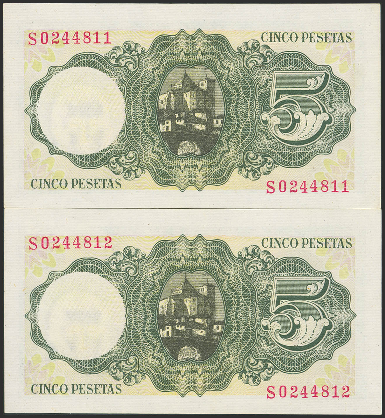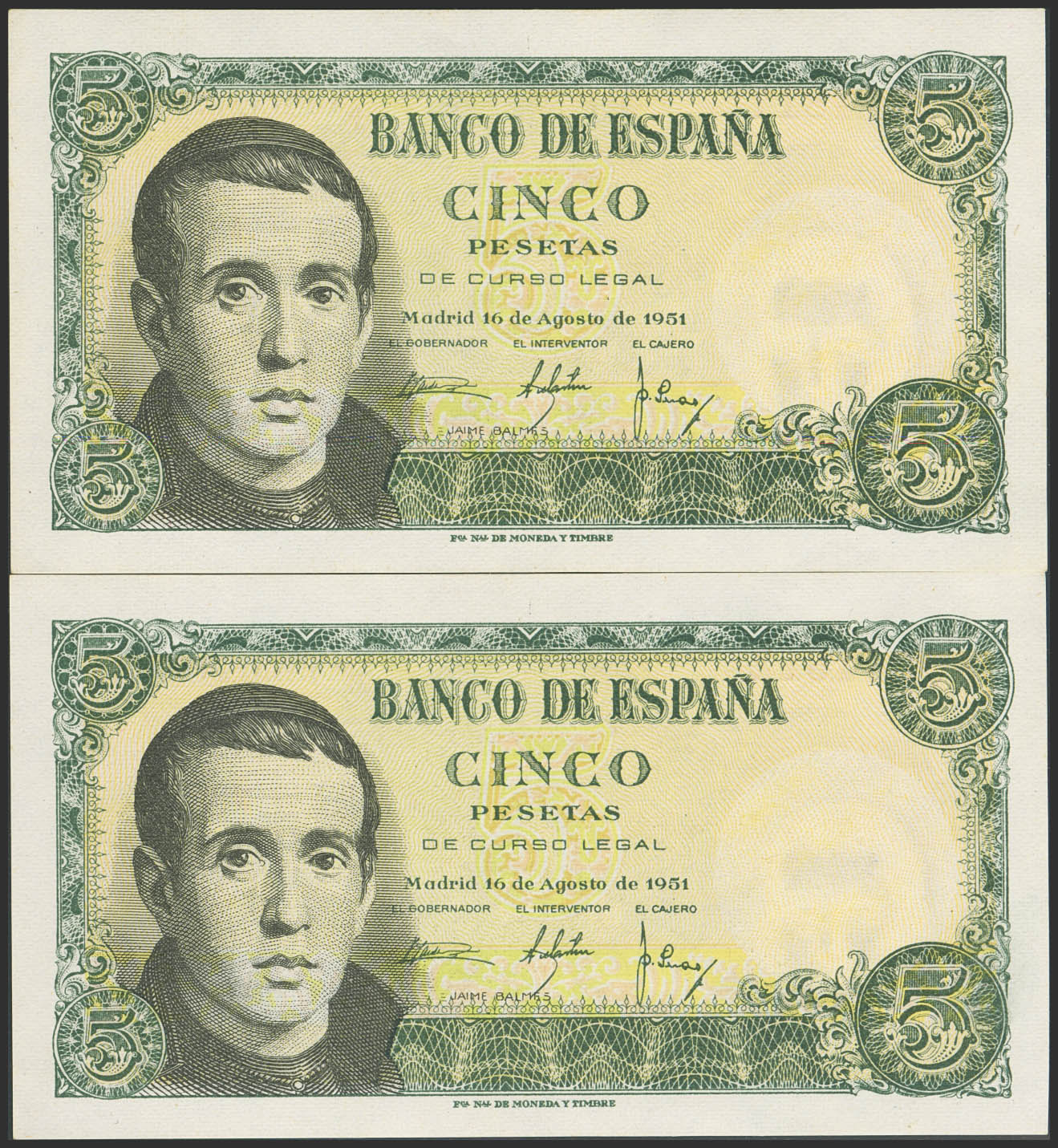 5 Pesetas. 16 de Agosto de 1951. Pareja correlativa. Serie S. (Edifil 2023: 459a). Apresto original. SC.