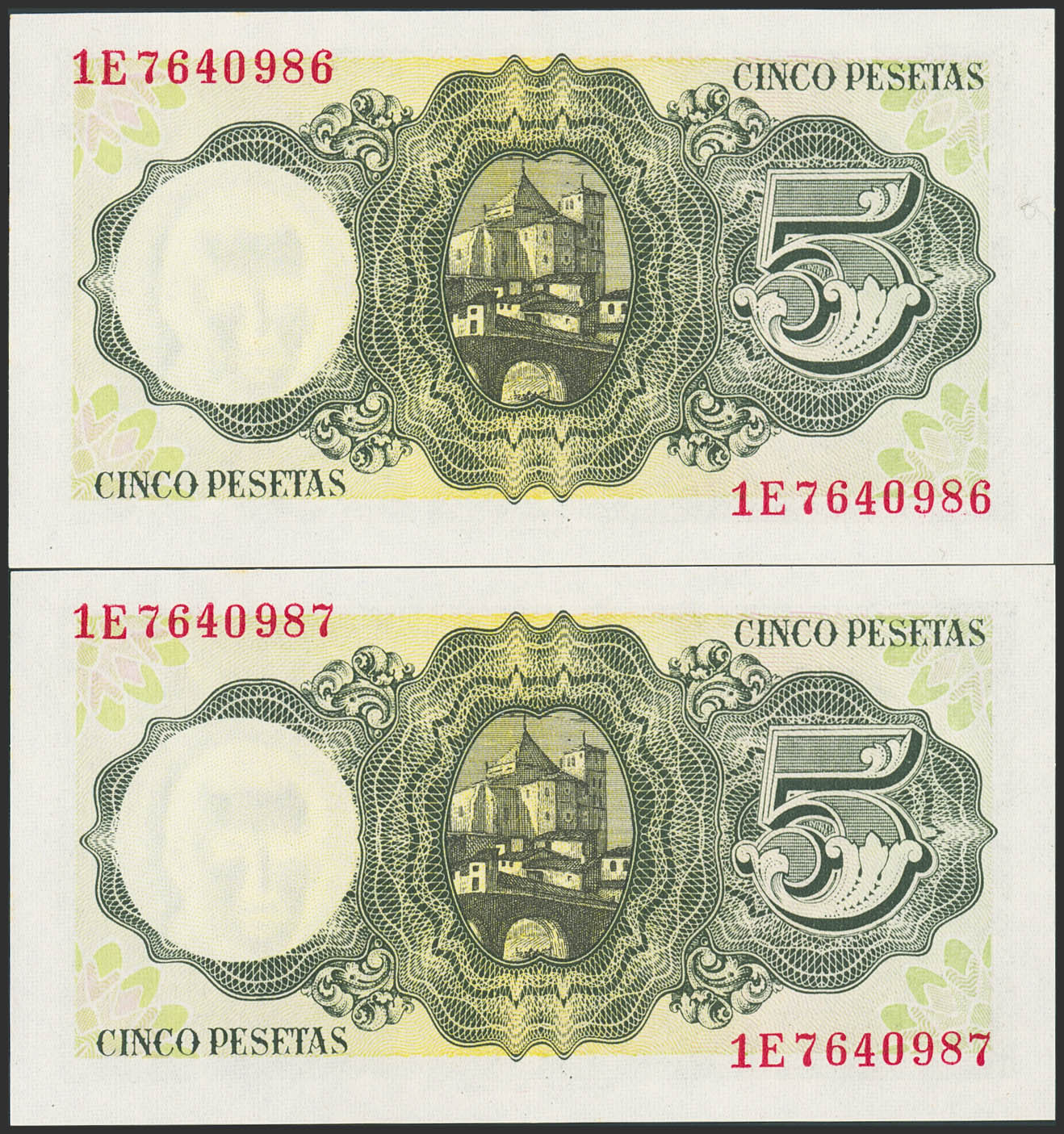 5 Pesetas. 16 de Agosto de 1951. Pareja correlativa. Serie 1E. (Edifil 2023: 459a). Apresto original. SC-.