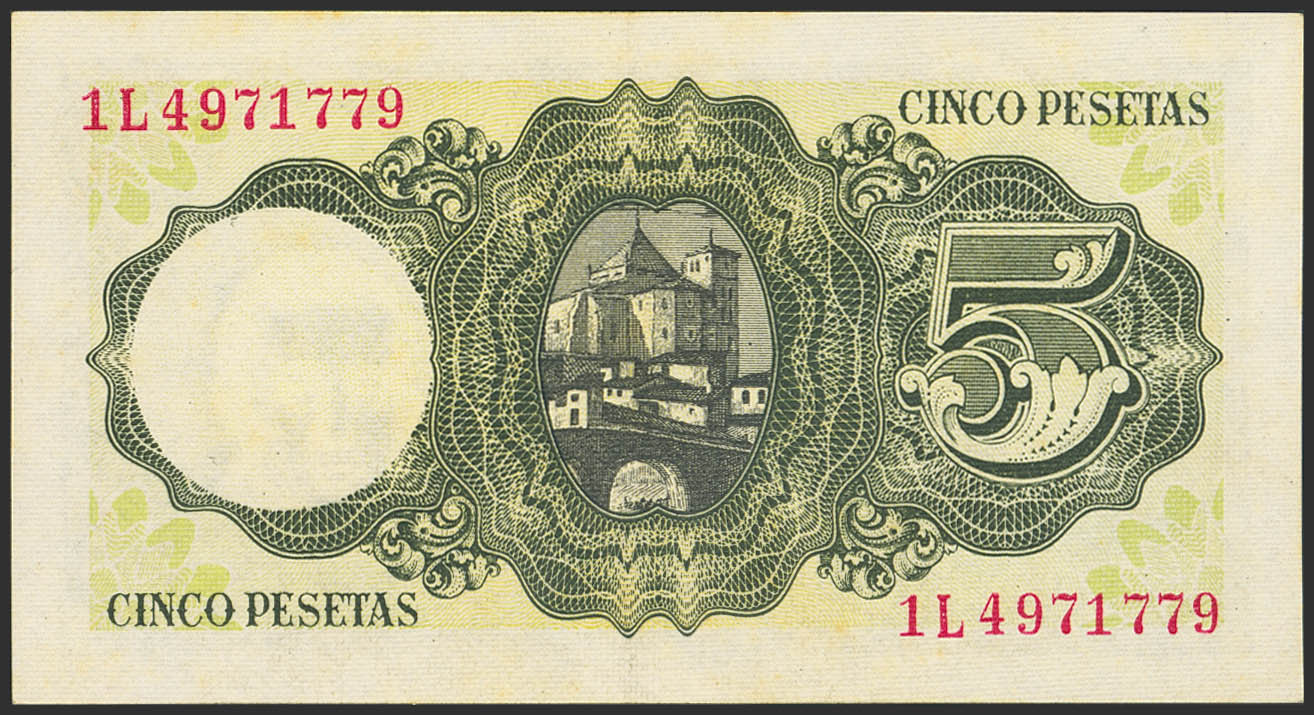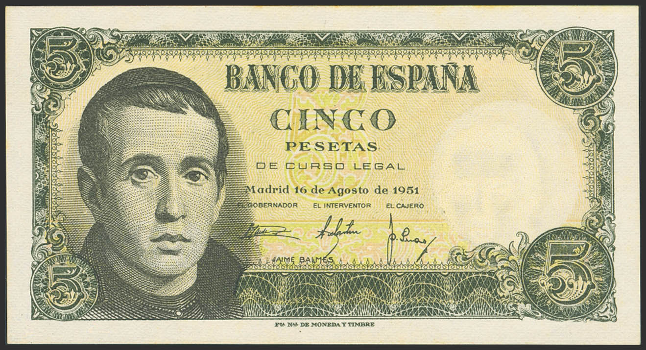 5 Pesetas. 16 de Agosto de 1951. Serie 1L, última serie emitida. (Edifil 2023: 459b). Apresto original, tonalizado. SC.