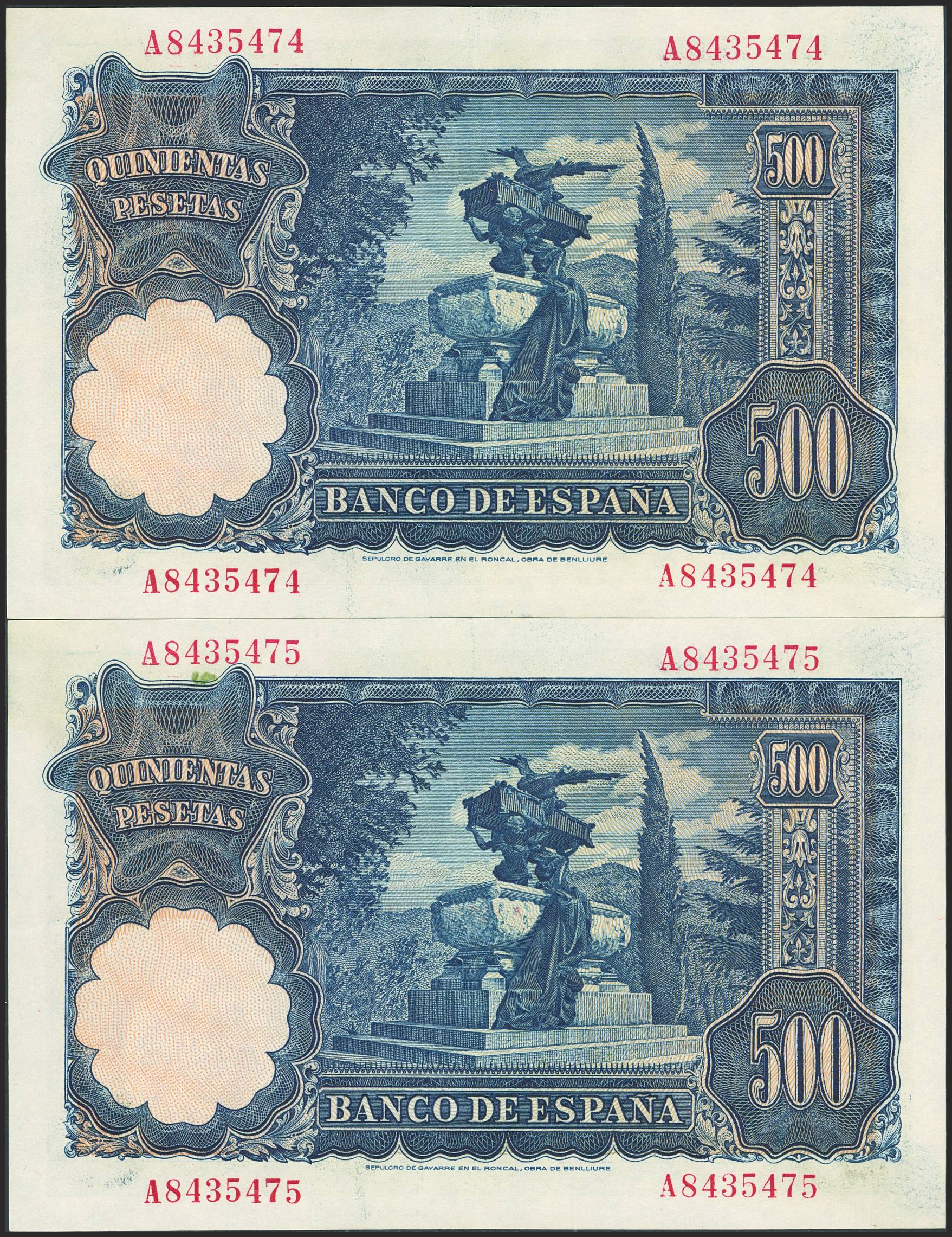 500 Pesetas. 16 de Noviembre de 1951. Pareja correlativa. Serie A. (Edifil 2023: 460a). Conserva gran parte de su apresto original. EBC+.
