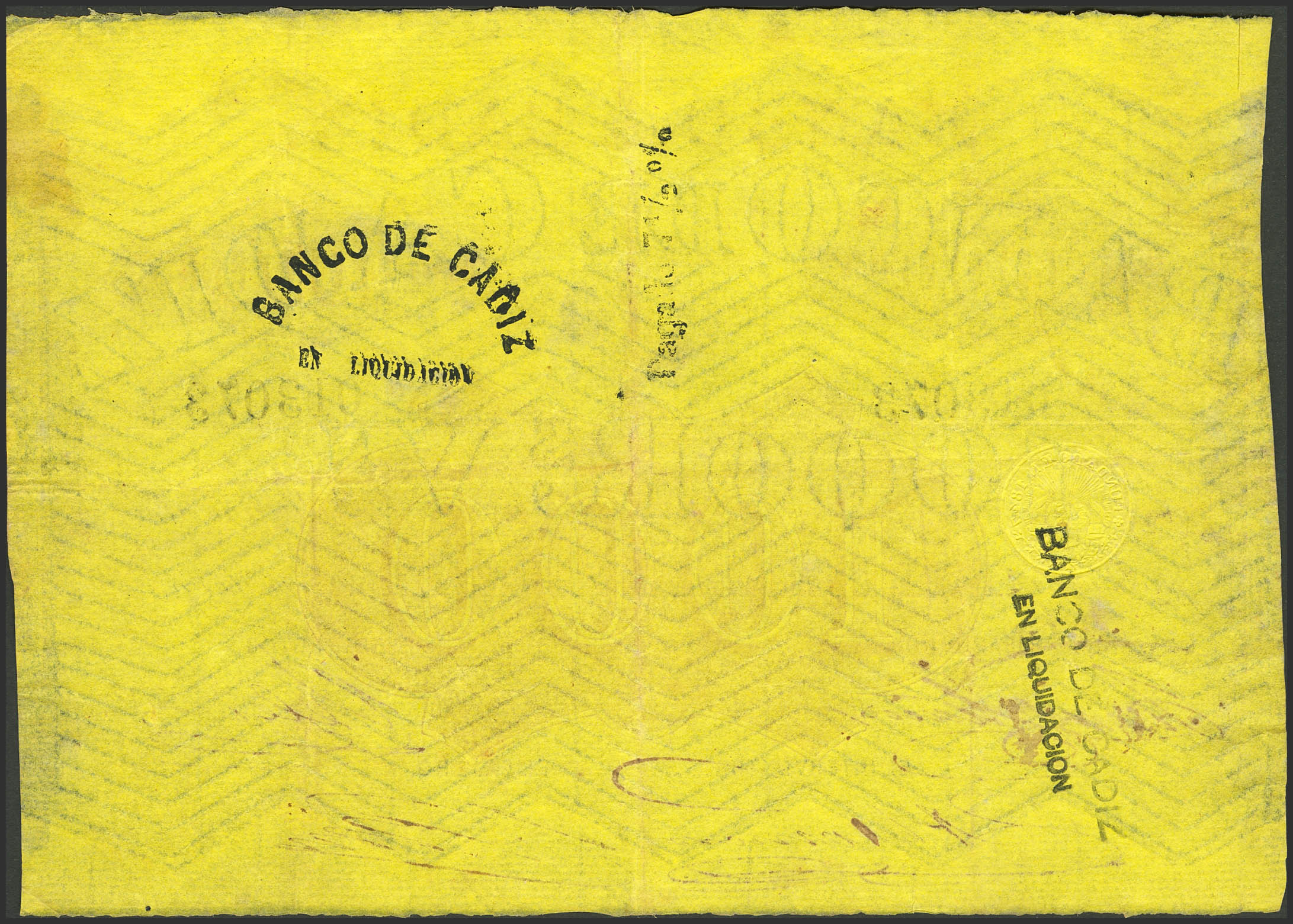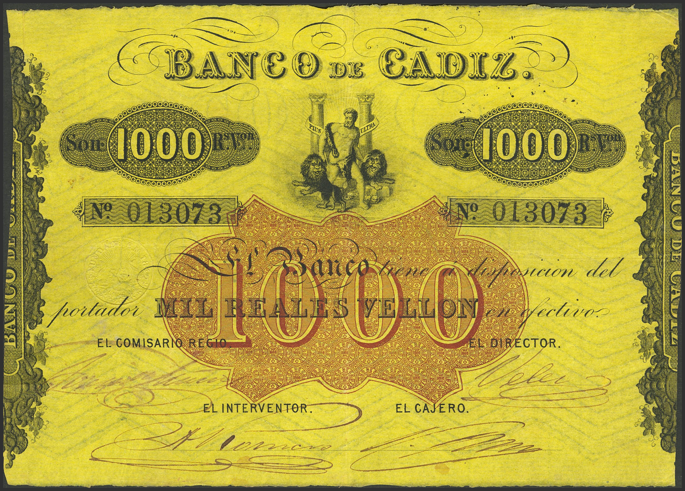 BANCO DE CADIZ. Emisión III. 1000 Reales. (Sin fechar). Cuatro firmas y resello en seco. (Edifil 2023: 81). Raro. MBC+.