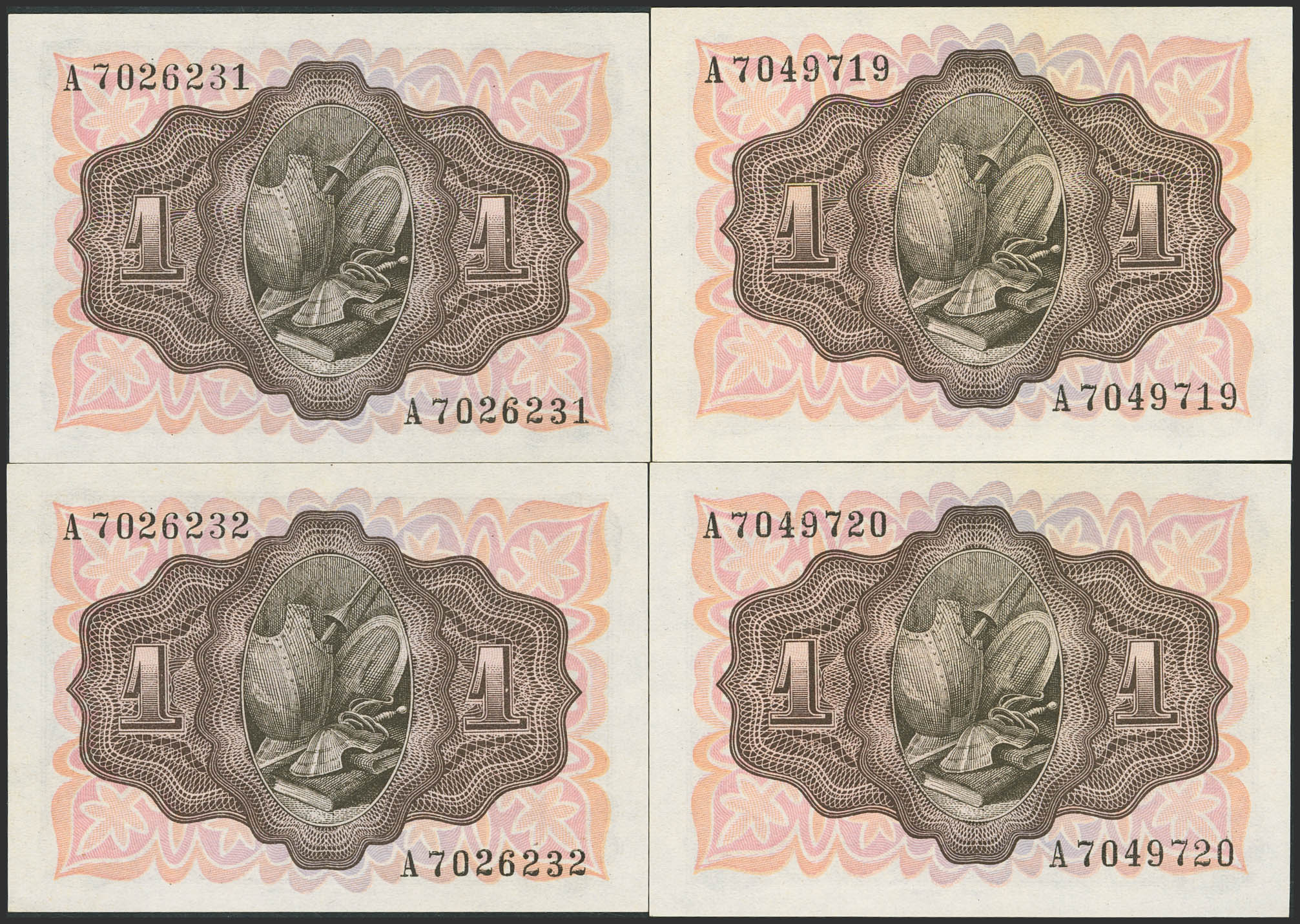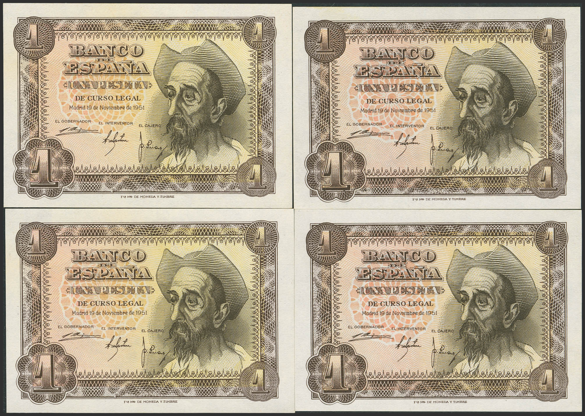 Conjunto de 4 billetes, correlativos entre sí, de 1 Peseta emitidos el 19 de Noviembre 1951, con la serie A. (Edifil 2023: 461a). SC.