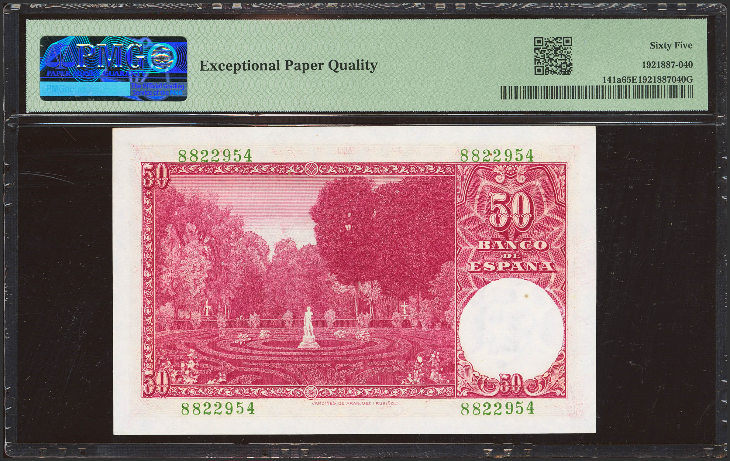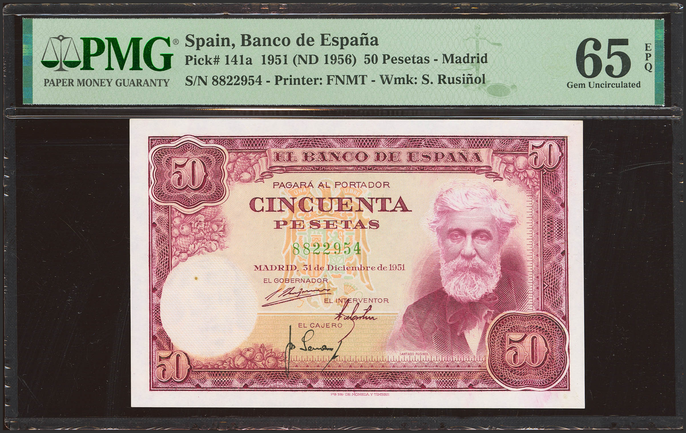 50 Pesetas. 31 de Diciembre de 1951. Sin serie. (Edifil 2023: 462, Pick: 141a). Apresto original. SC. Encapsulado PMG65EPQ.