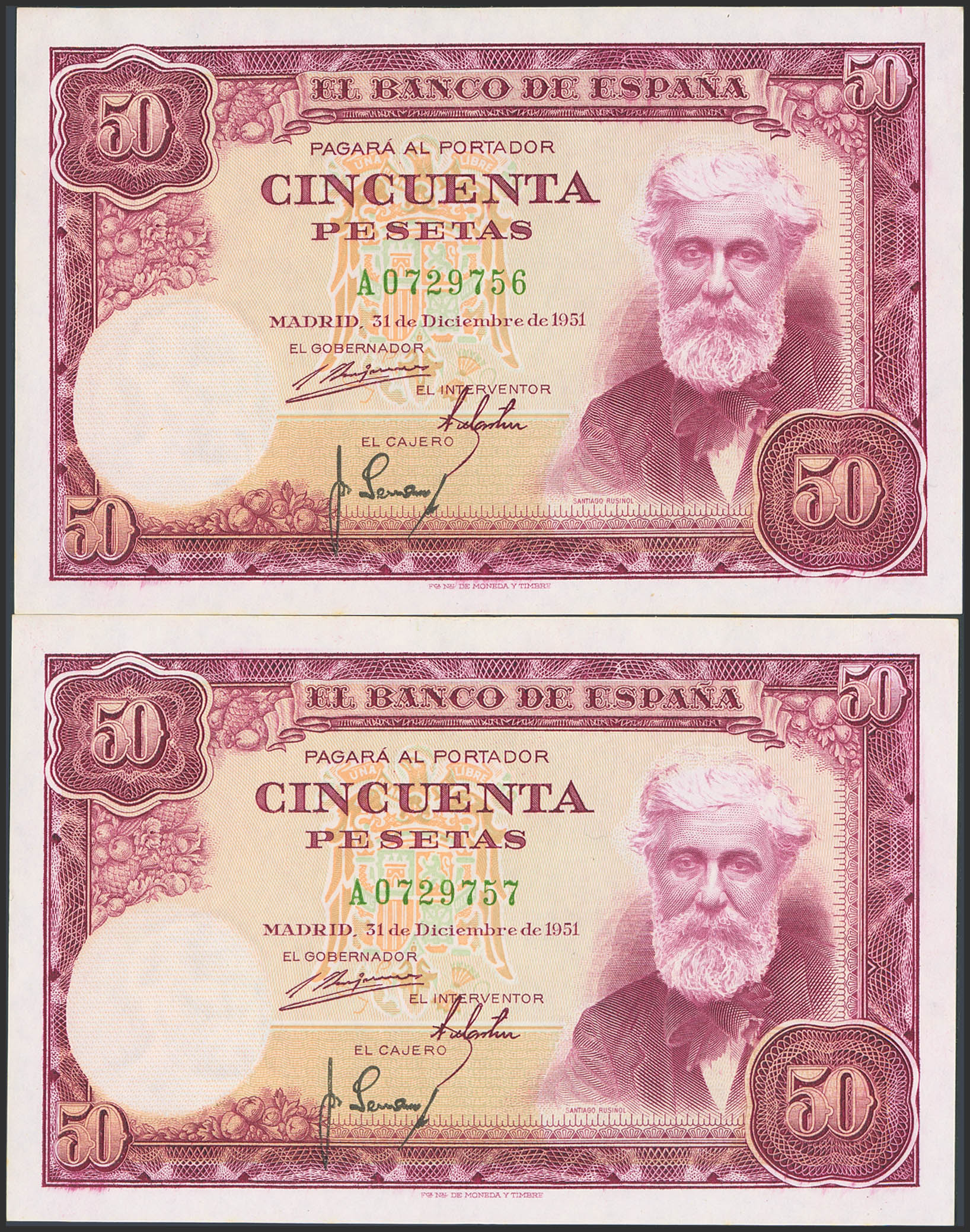 50 Pesetas. 31 de Diciembre de 1951. Pareja correlativa. Serie A. (Edifil 2021: 462a). Conserva todo su apresto original, sombritas del tiempo. SC-.