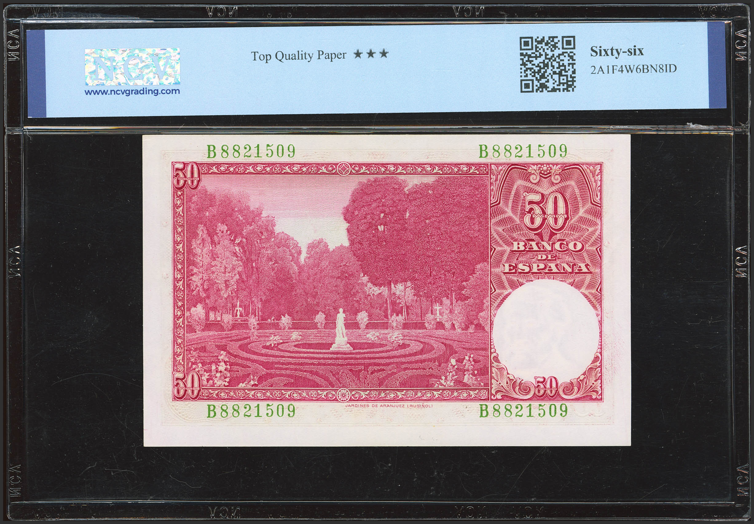 50 Pesetas. 31 de Diciembre de 1951. Serie B. (Edifil 2023: 462a, Pick: 141a). Apresto original. SC. Encapsulado NCV66TPQ.