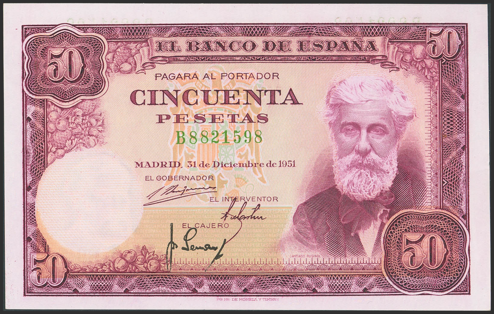50 Pesetas. 31 de Diciembre de 1951. Serie B. (Edifil 2023: 462a). Apresto original. SC.