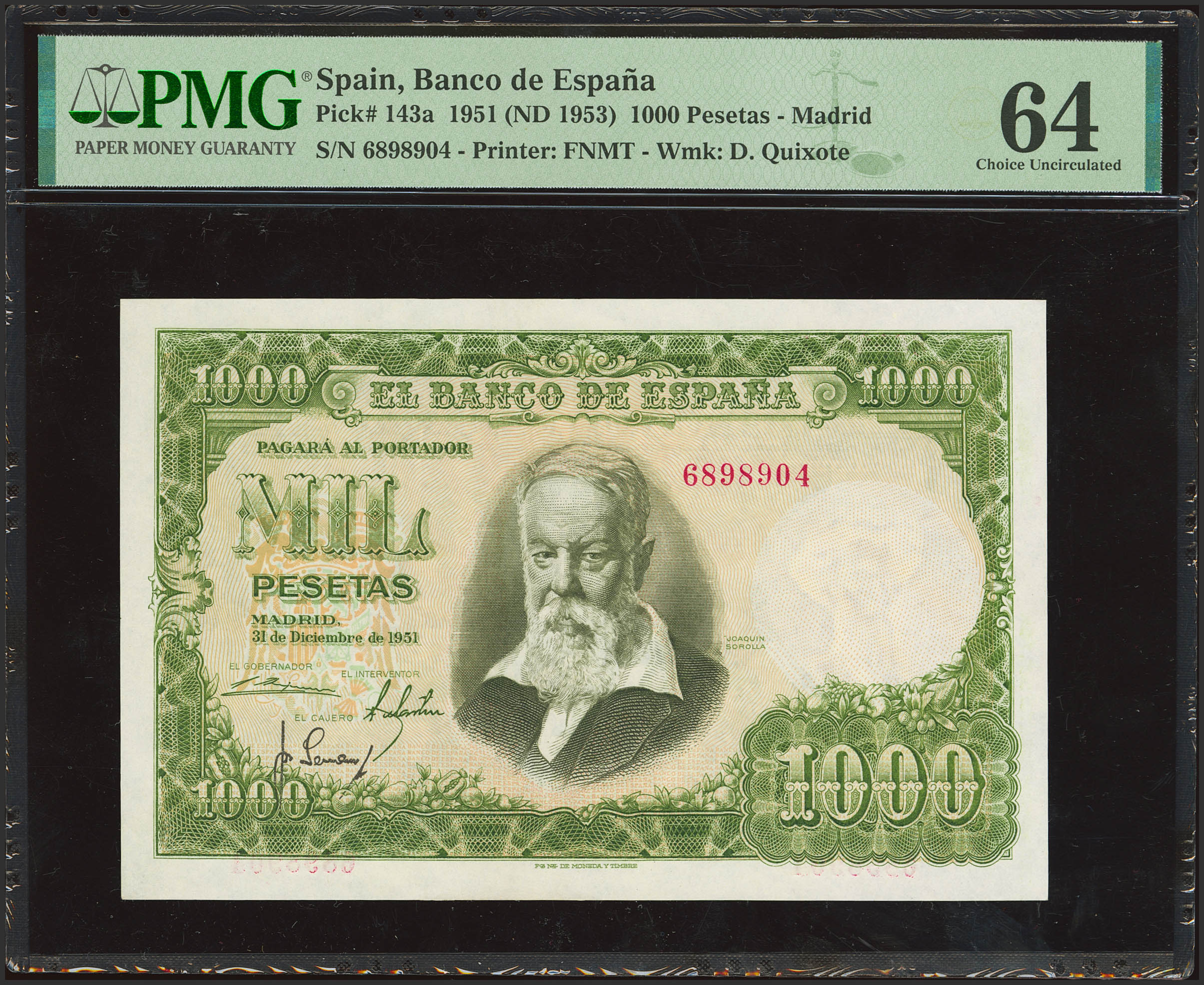 1000 Pesetas. 31 de Diciembre de 1951. Sin serie. (Edifil 2023: 463, Pick: 143a). Raro en esta calidad. SC. Encapsulado PMG64.