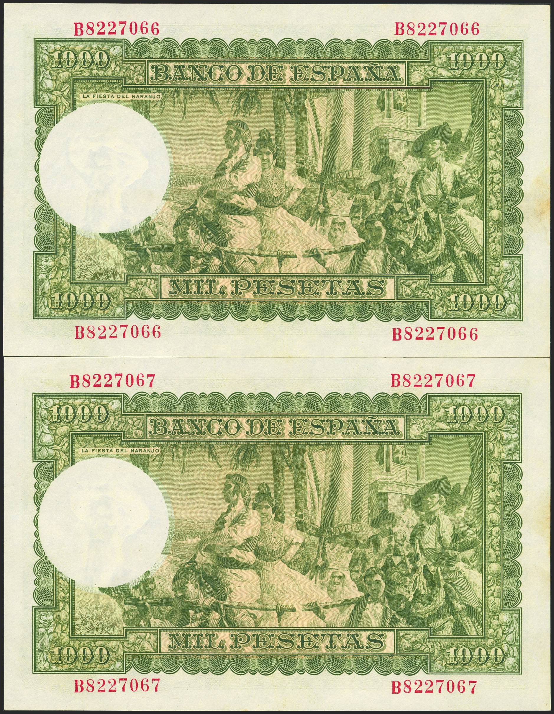 1000 Pesetas. 31 de Diciembre de 1951. Pareja correlativa. Serie B. (Edifil 2023: 463a). Apresto original. EBC.