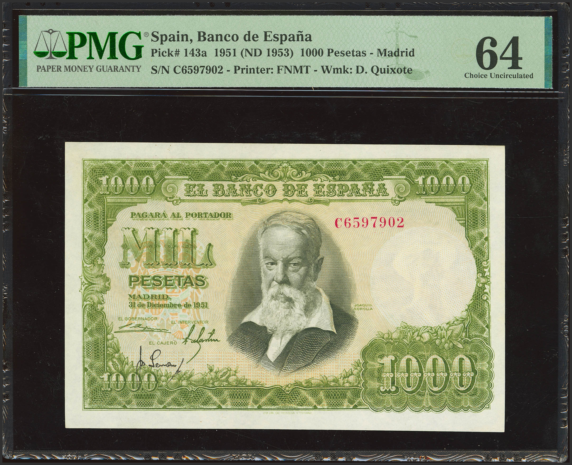 1000 Pesetas. 31 de Diciembre de 1951. Serie C, última serie emitida. (Edifil 2023: 463b, Pick: 143a). SC. Encapsulado PMG64.