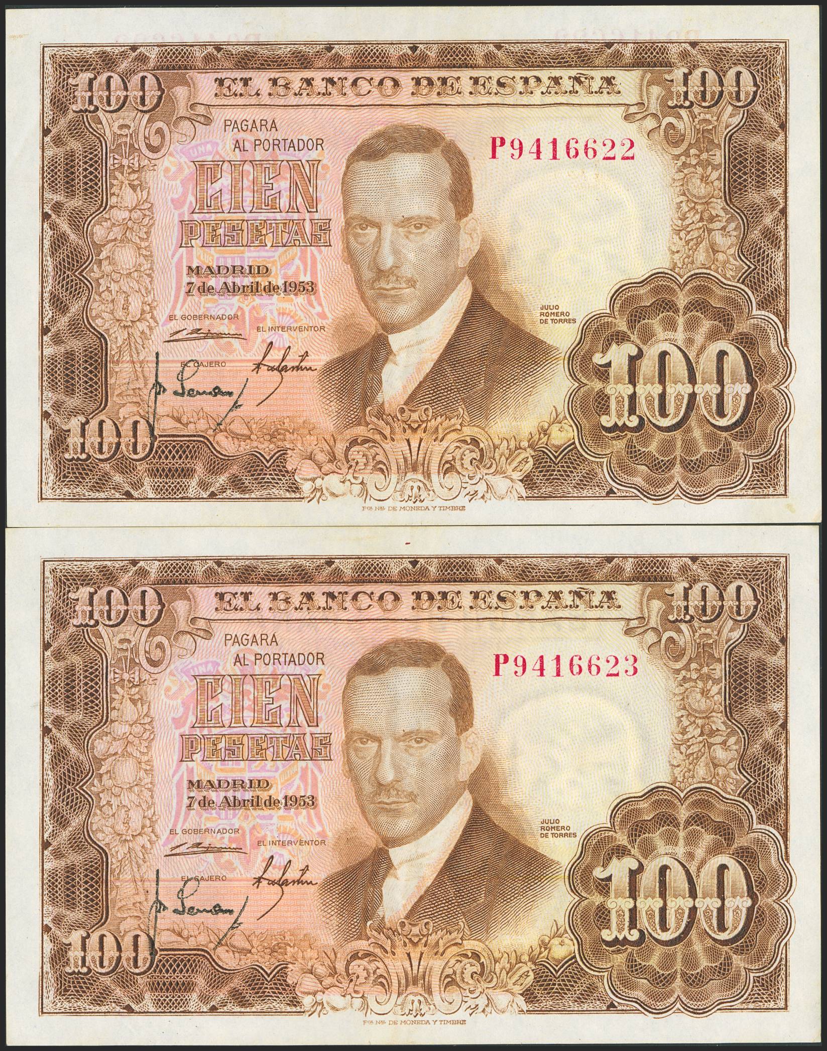 100 Pesetas. 7 de Abril de 1953. Pareja correlativa. Serie P. (Edifil 2023: 464b). Conserva gran parte de su apresto original. EBC+.