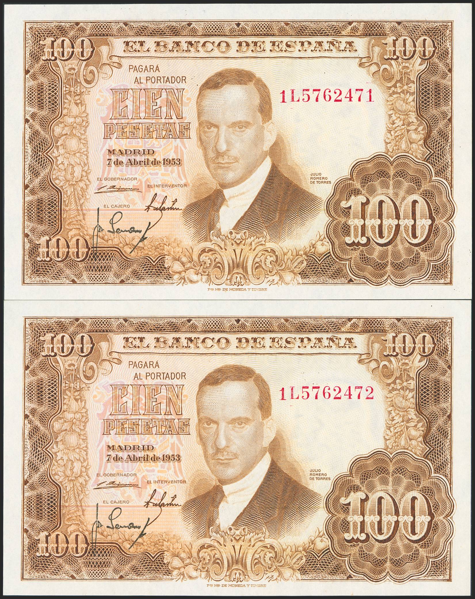 100 Pesetas. 7 de Abril de 1953. Pareja correlativa. Serie 1L. (Edifil 2023: 464c). Apresto original. SC.