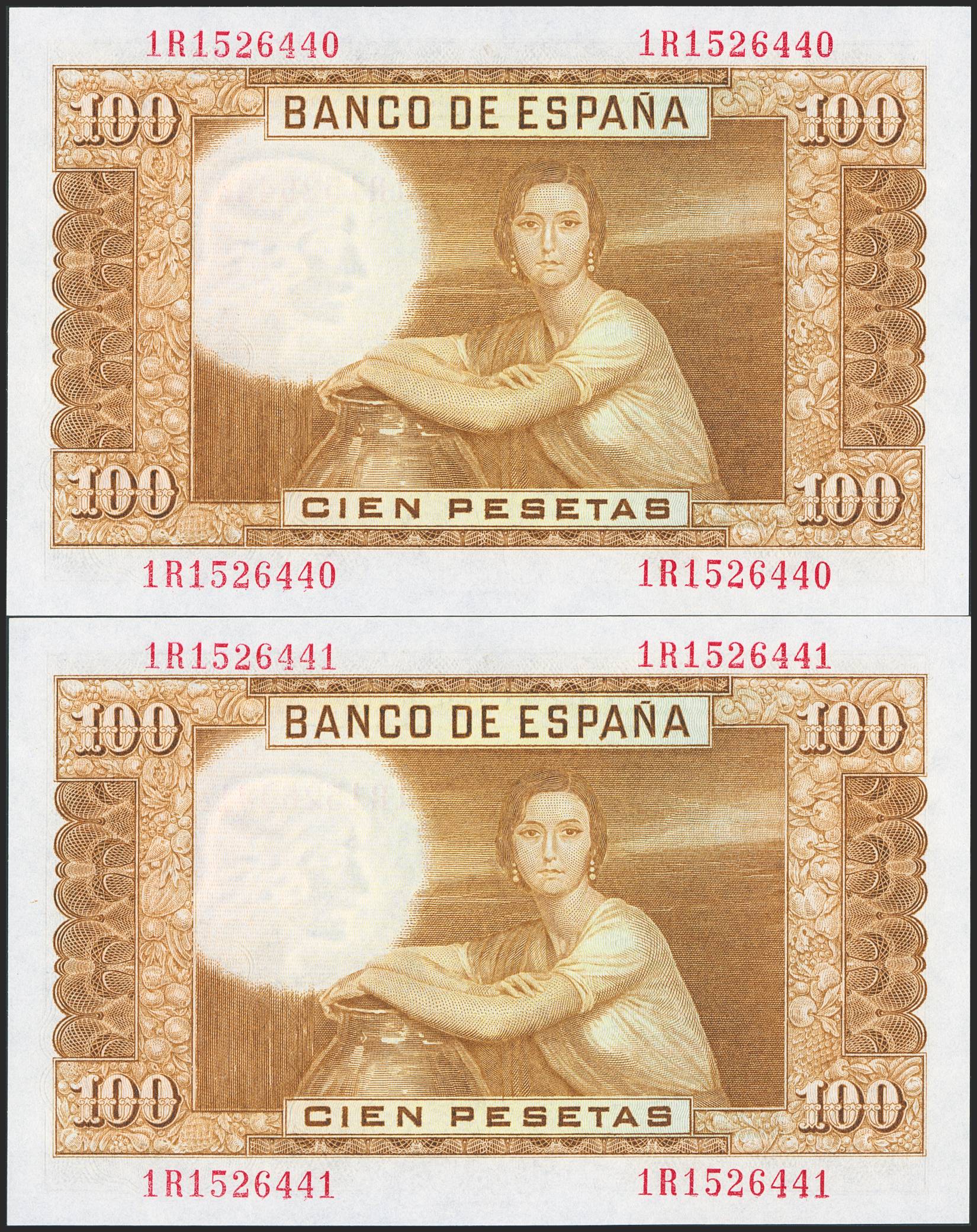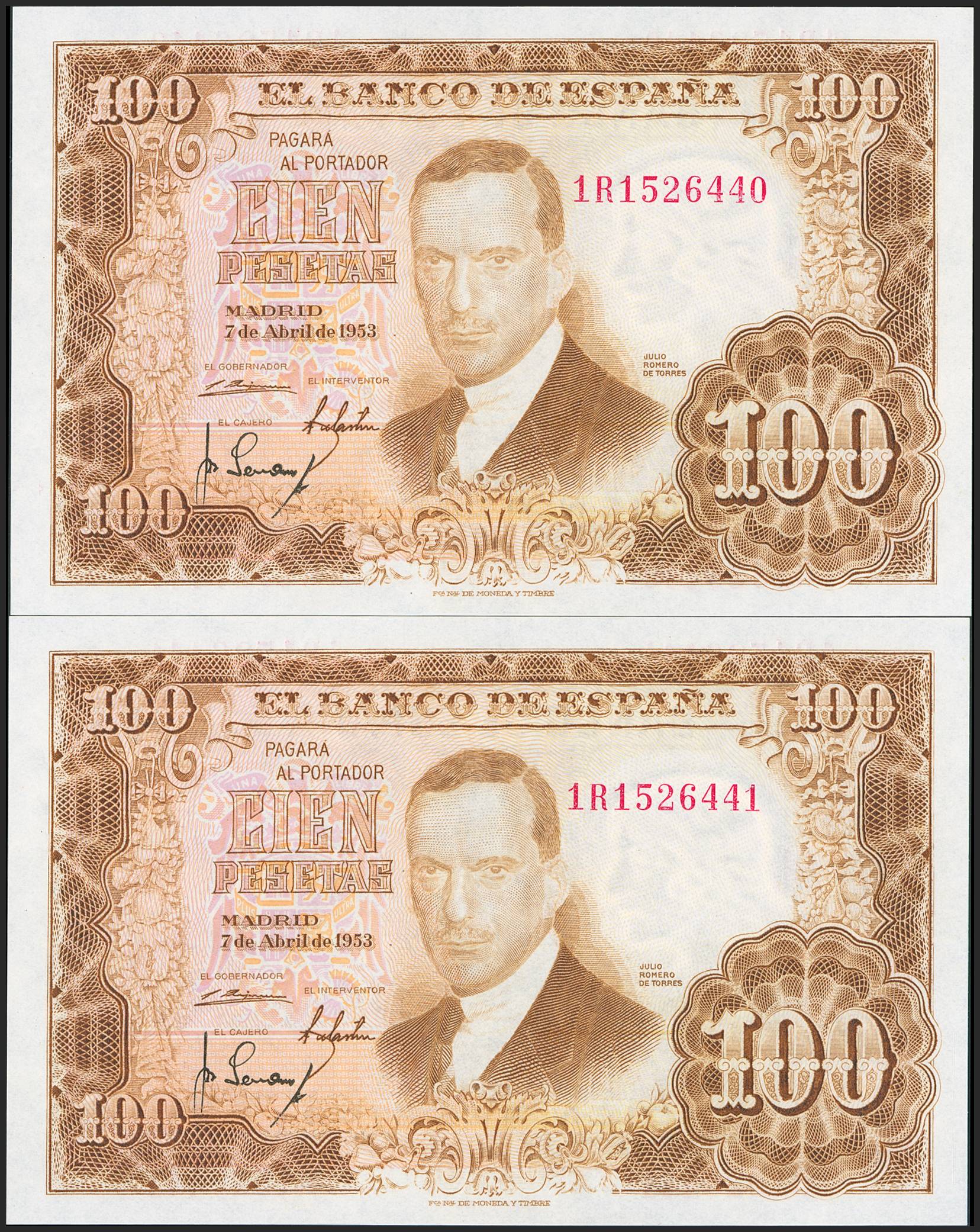 100 Pesetas. 7 de Abril de 1953. Pareja correlativa. Serie 1R. (Edifil 2023: 464c). Apresto original. SC.