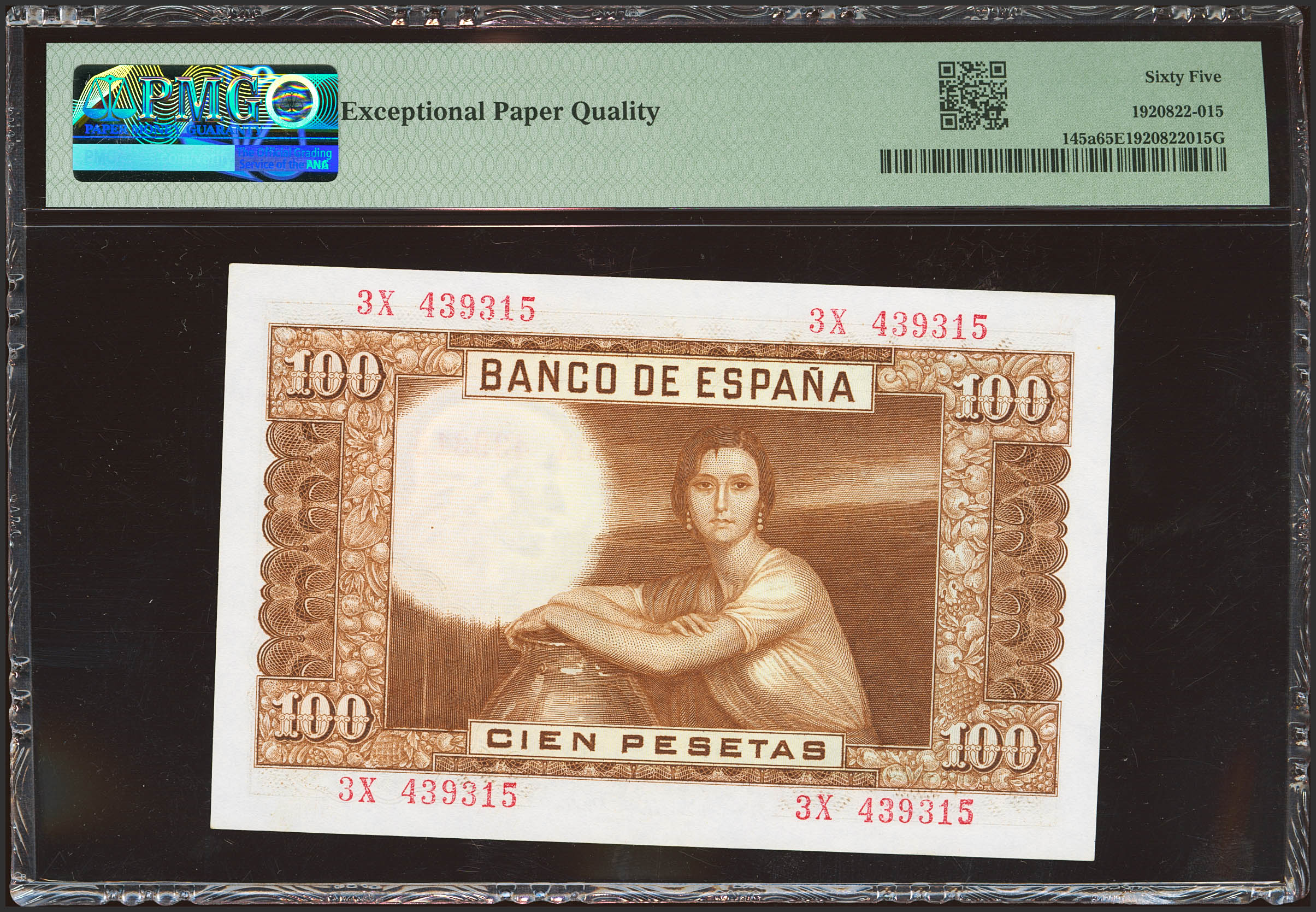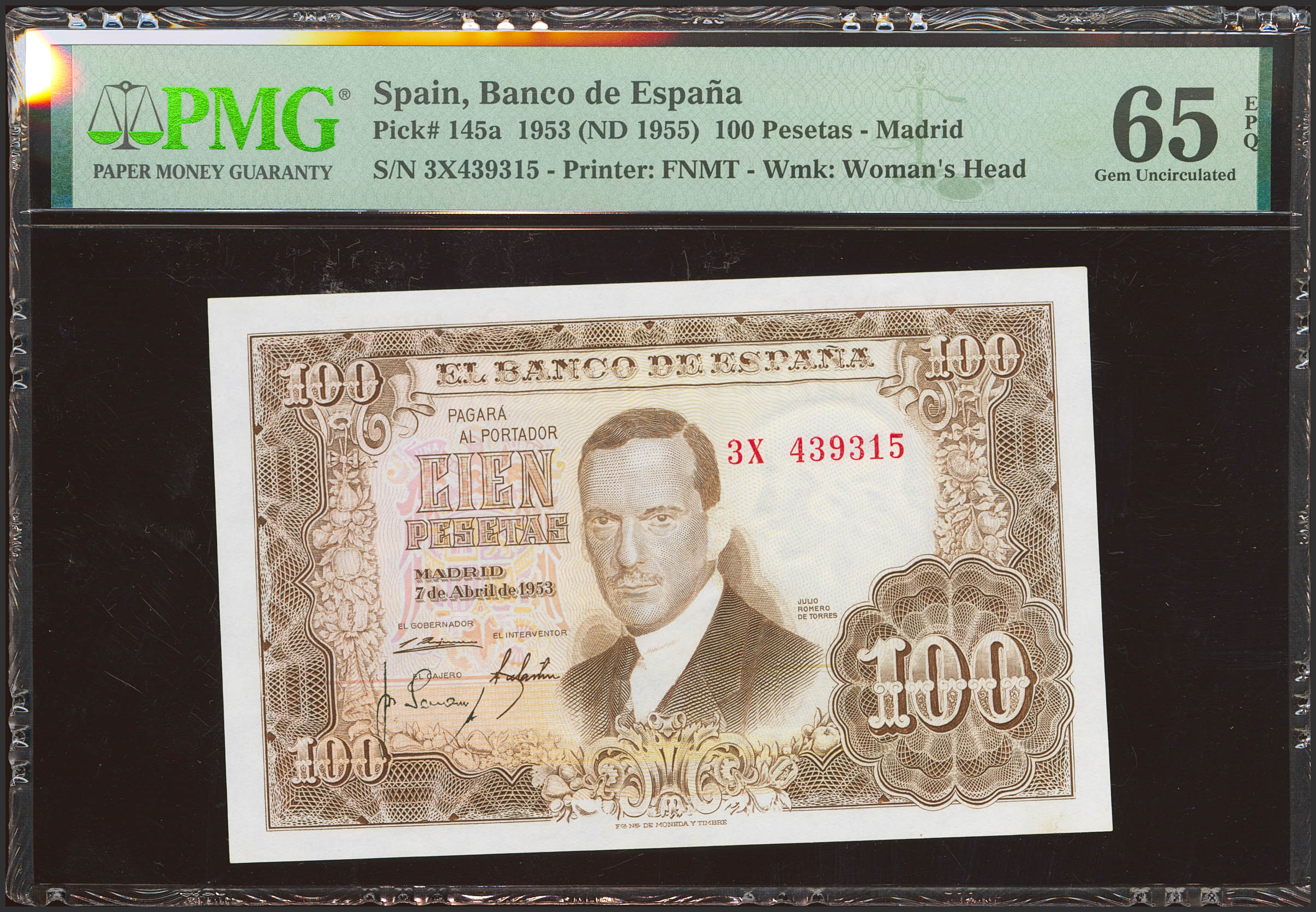 100 Pesetas. 7 de Abril de 1953. Serie 3X, última serie emitida. (Edifil 2023: 464e, Pick: 145a). Raro en esta excepcional calidad, apresto original. SC. Encapsulado PMG65EPQ.
