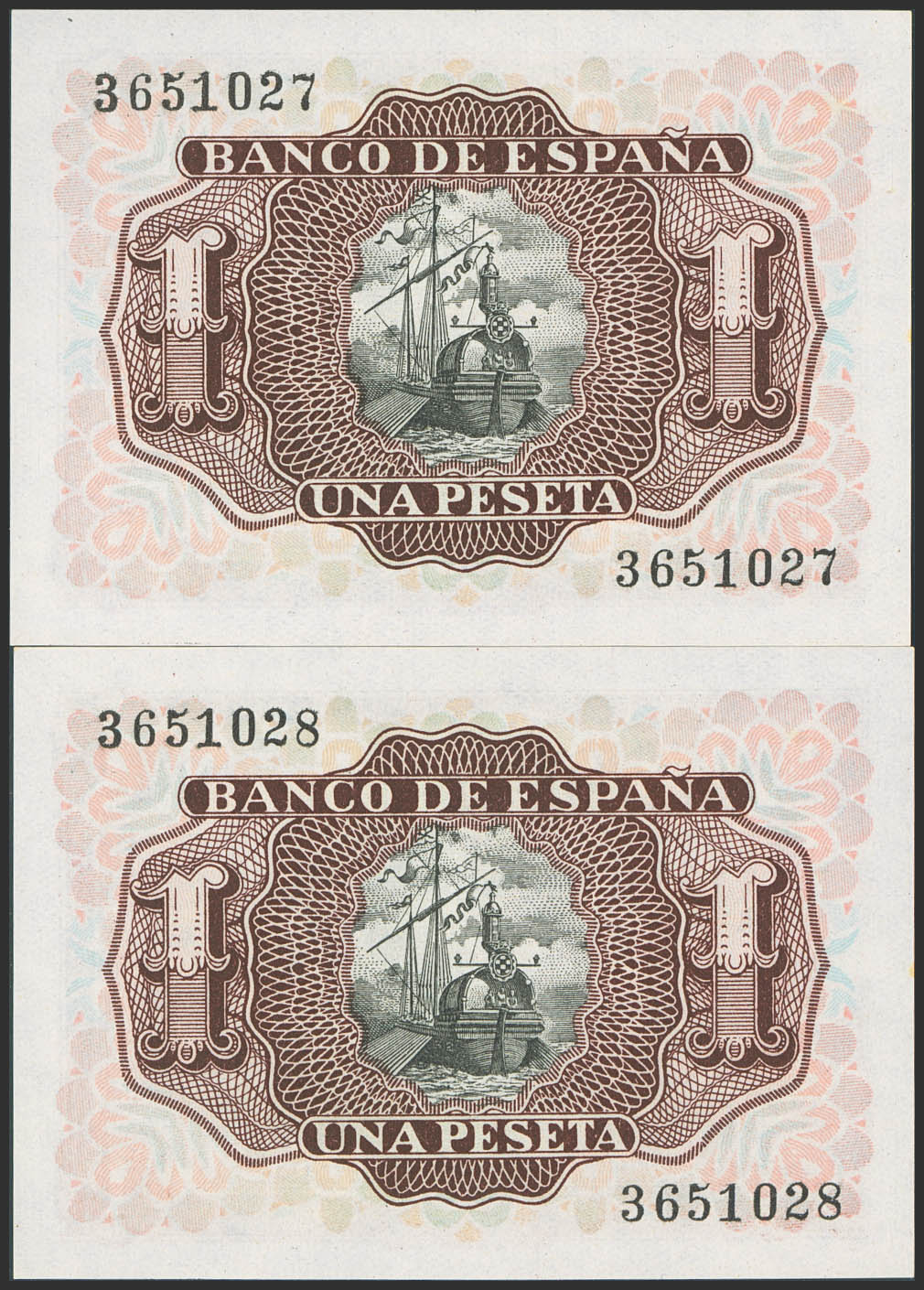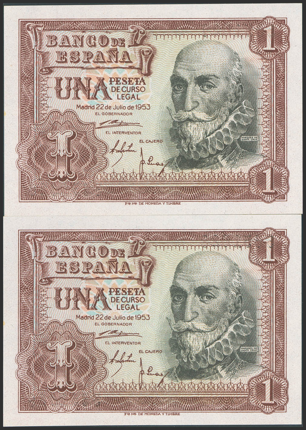 1 Peseta. 23 de Julio de 1953. Pareja correlativa. Sin serie. (Edifil 2023: 465). Apresto original. SC.