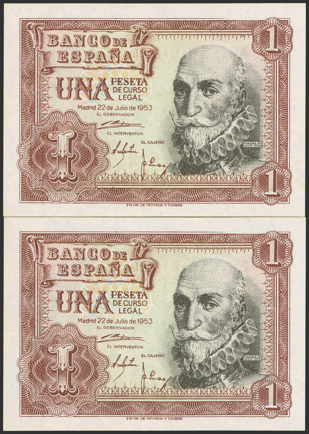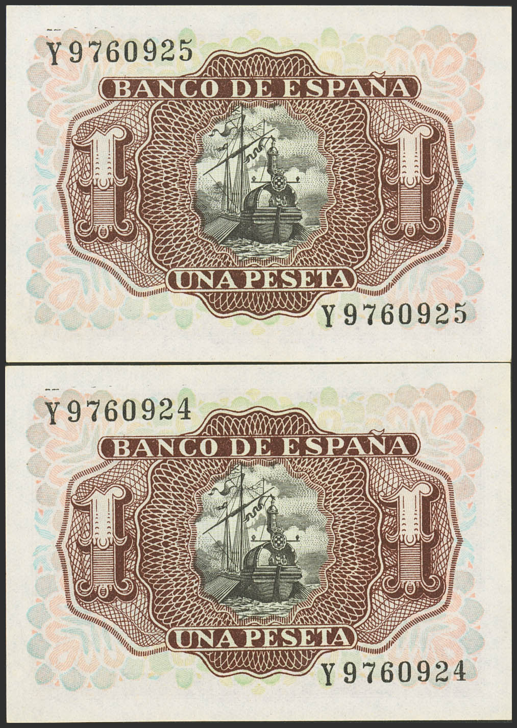 1 Peseta. 22 de Julio de 1953. Pareja correlativa. Serie Y. (Edifil 2023: 465a). Apresto original. SC.