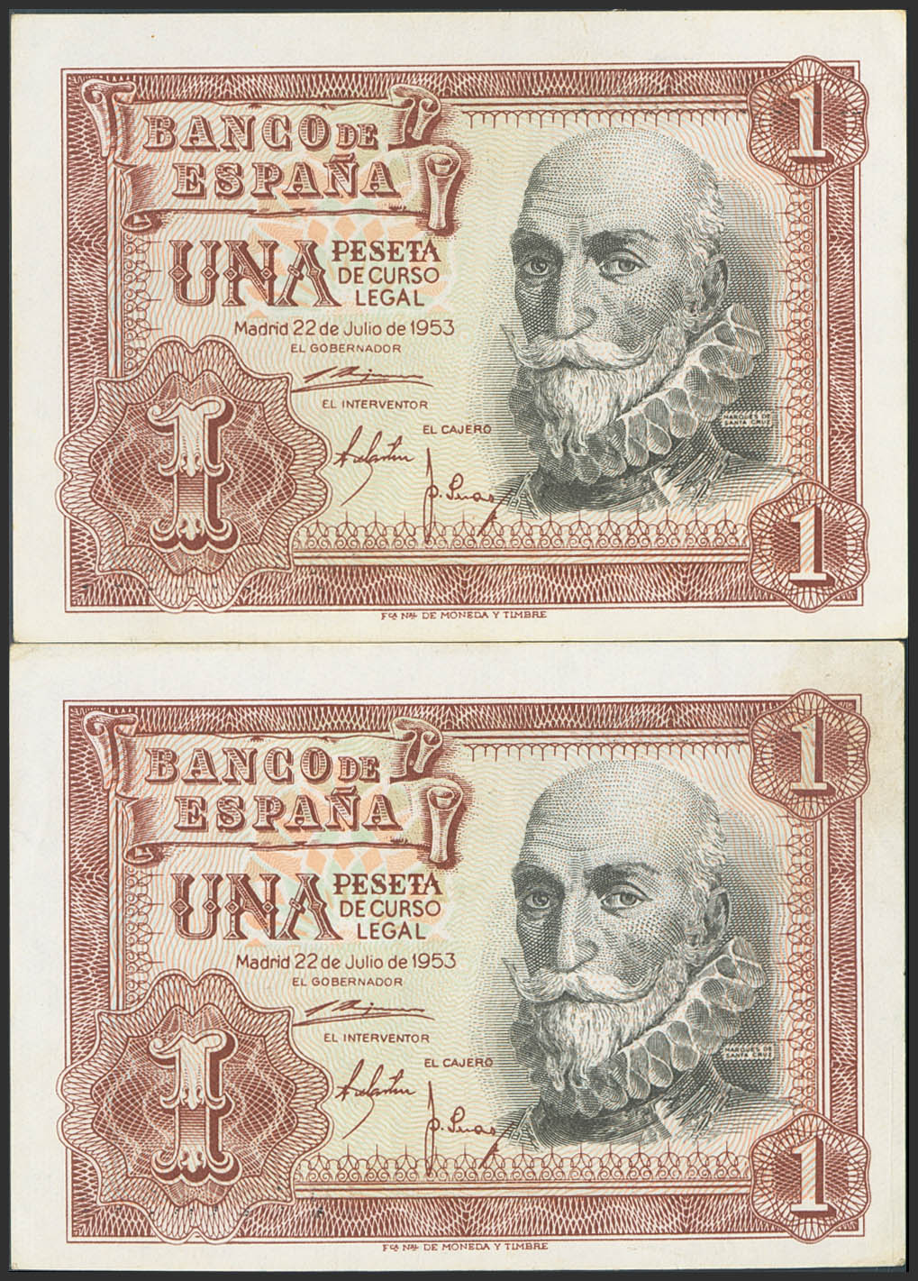 1 Peseta. 22 de Julio de 1953. Pareja correlativa. Serie 1G, última serie emitida. (Edifil 2023: 465b). Apresto original. SC-.