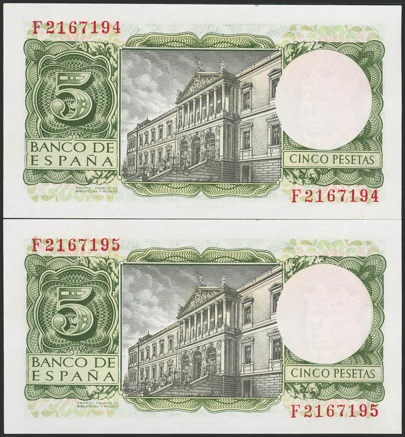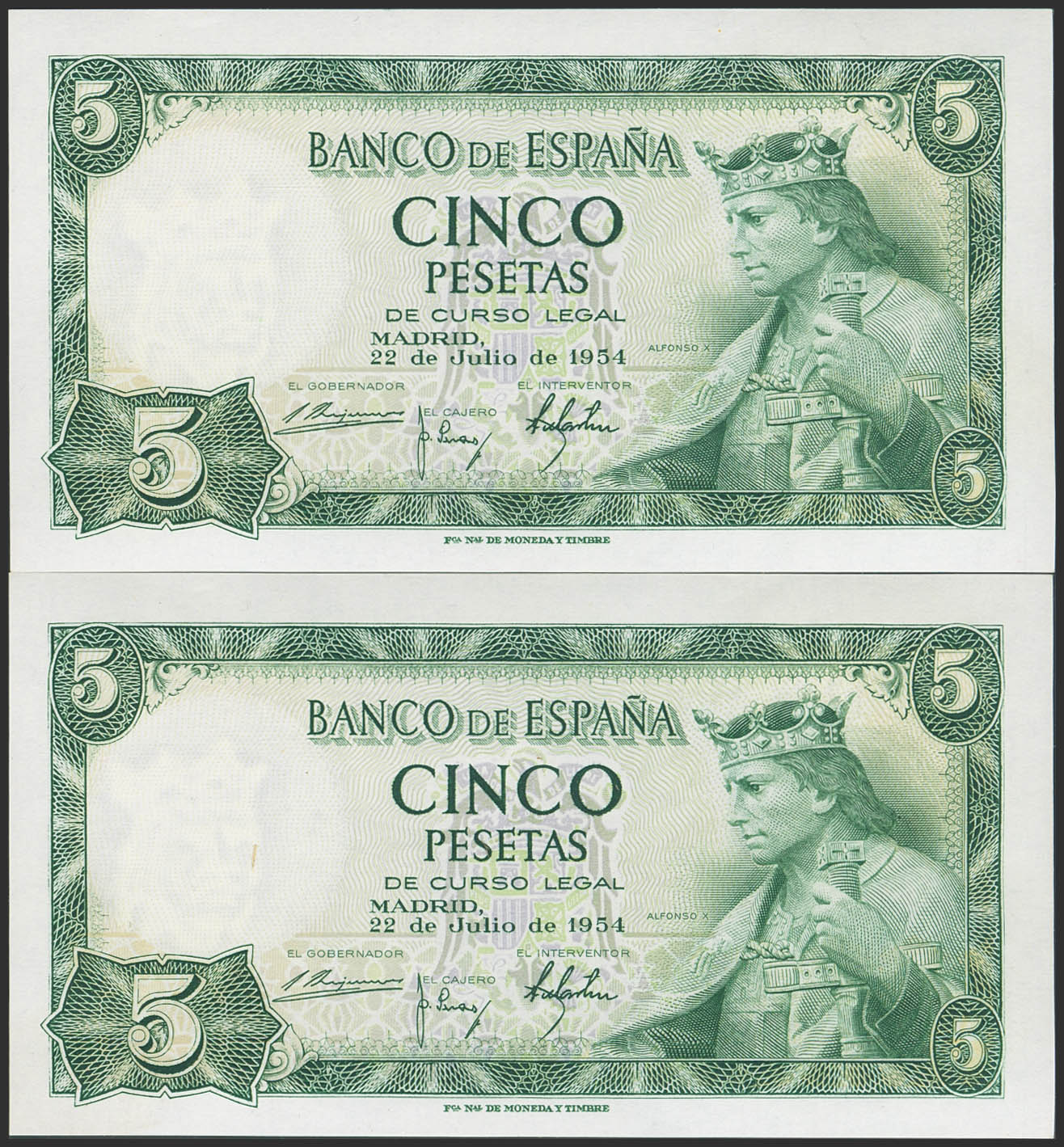 5 Pesetas. 22 de Julio de 1954. Pareja correlativa. Serie F. (Edifil 2023: 466a). Apresto original. SC.