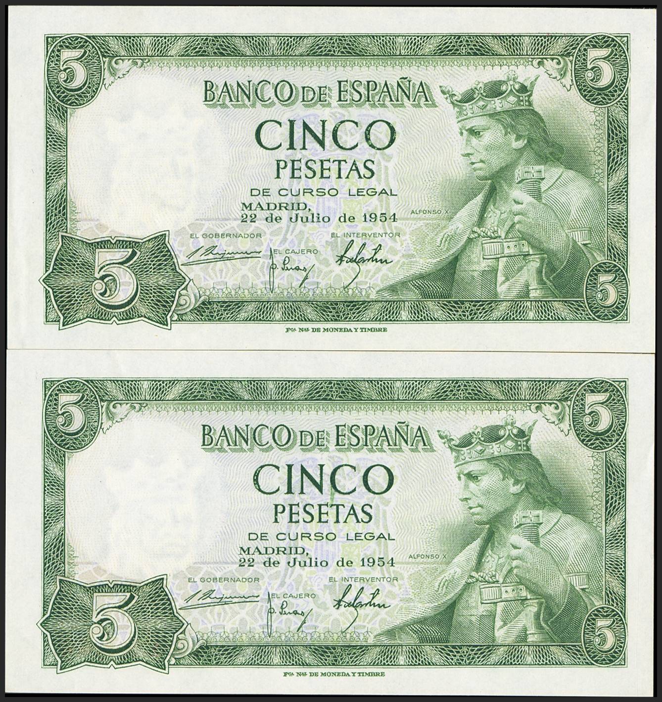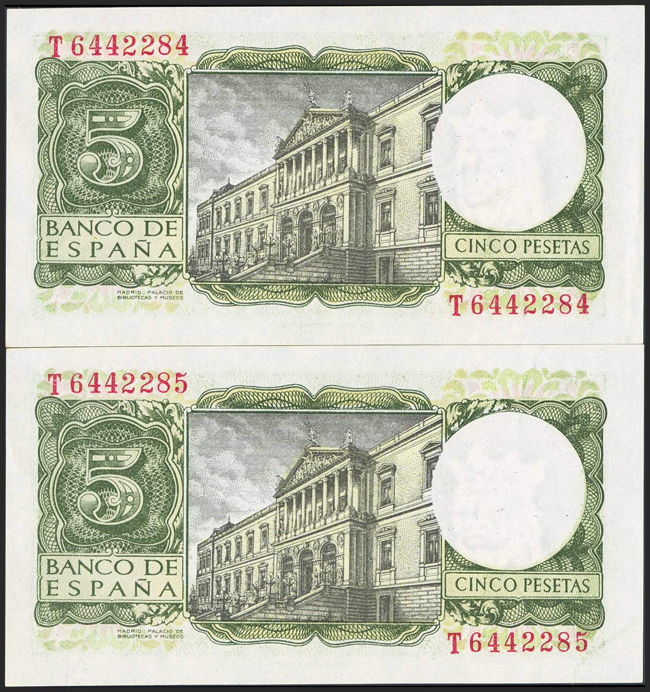 5 Pesetas. 22 de Julio de 1954. Pareja correlativa. Serie T. (Edifil 2023: 466a). Apresto original. EBC+++.