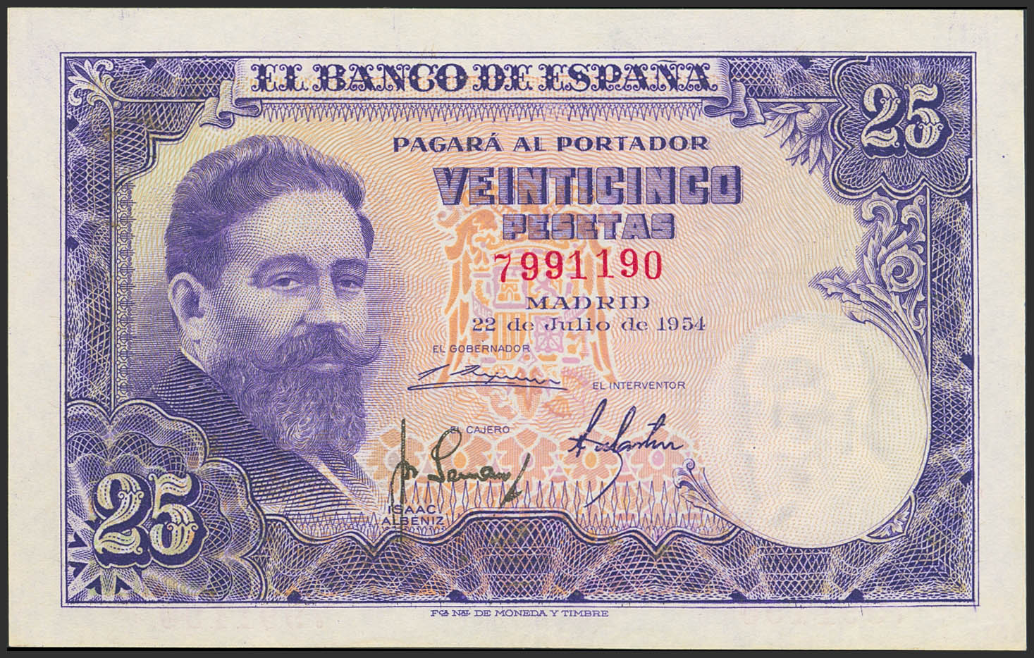 25 Pesetas. 22 de Julio de 1954. Sin serie. (Edifil 2023: 467). Apresto original. EBC+.
