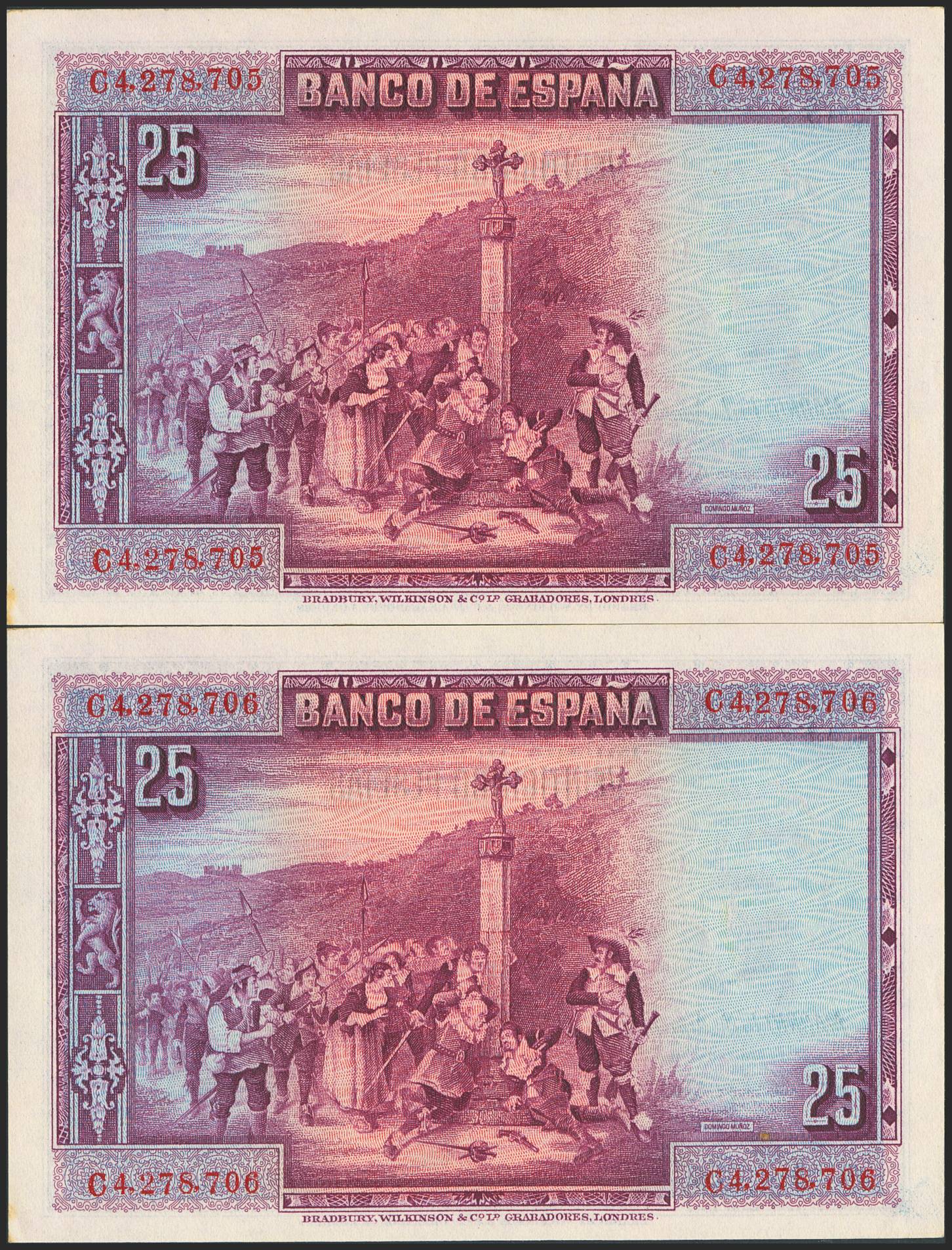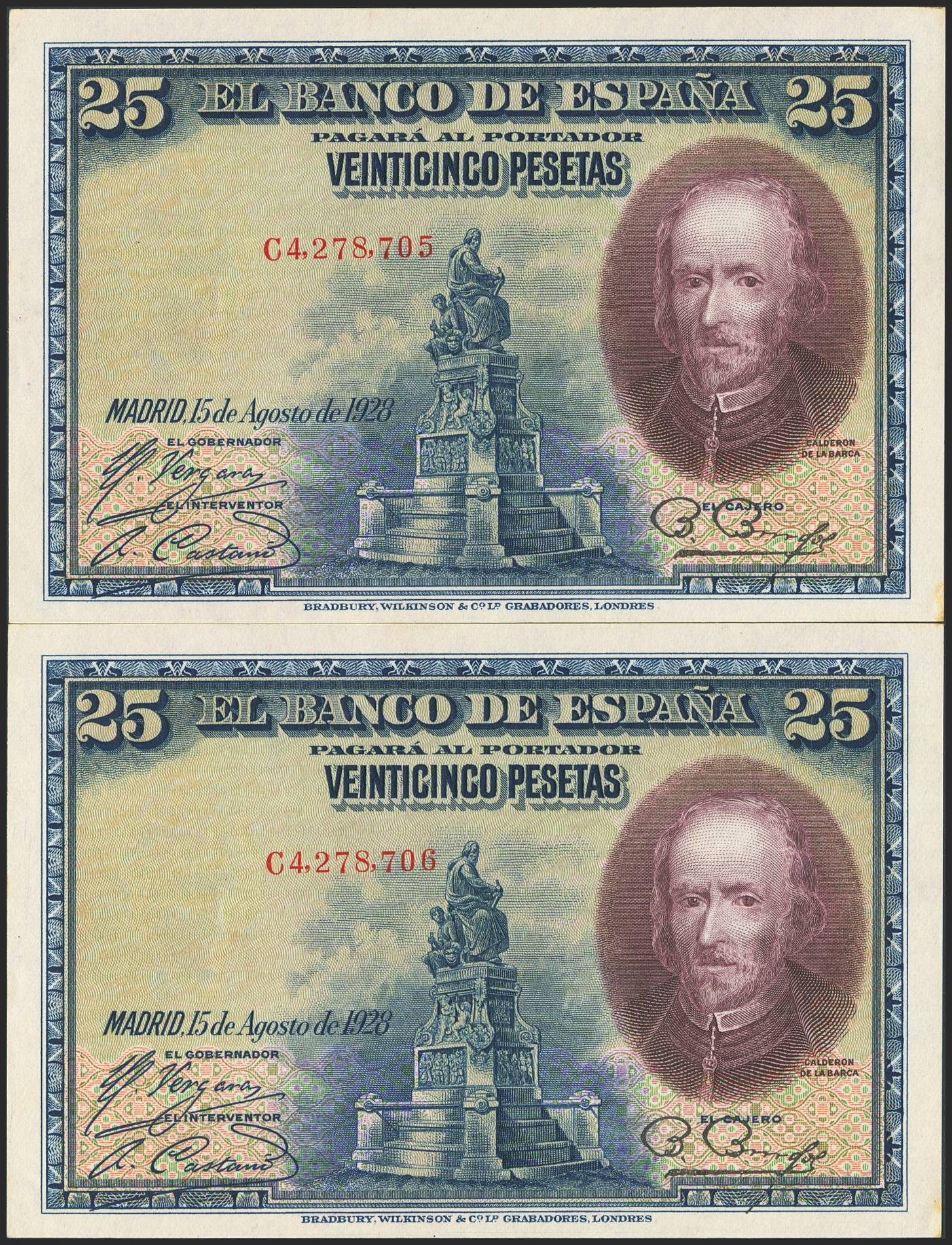 25 Pesetas. 15 de Agosto de 1928. Pareja correlativa. Serie C. (Edifil 2023: 353). Conservan gran parte de su apresto original. SC--.