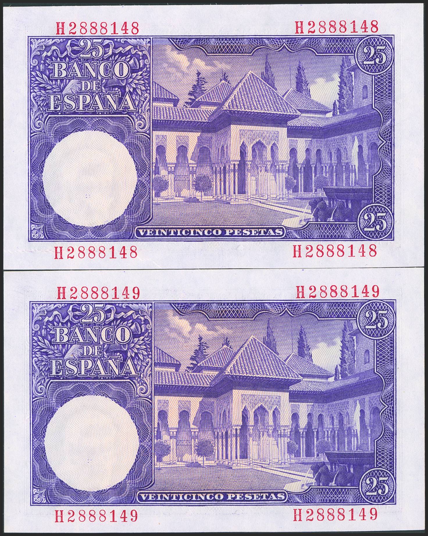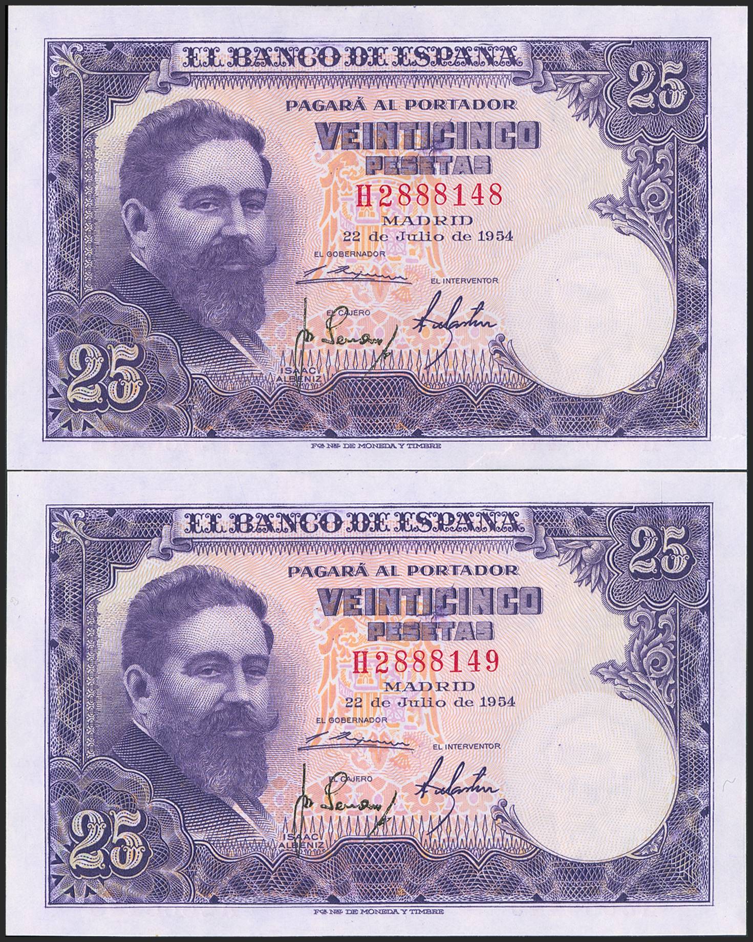 25 Pesetas. 22 de Julio de 1954. Pareja correlativa. Serie H. (Edifil 2023: 467a). Apresto original. SC.