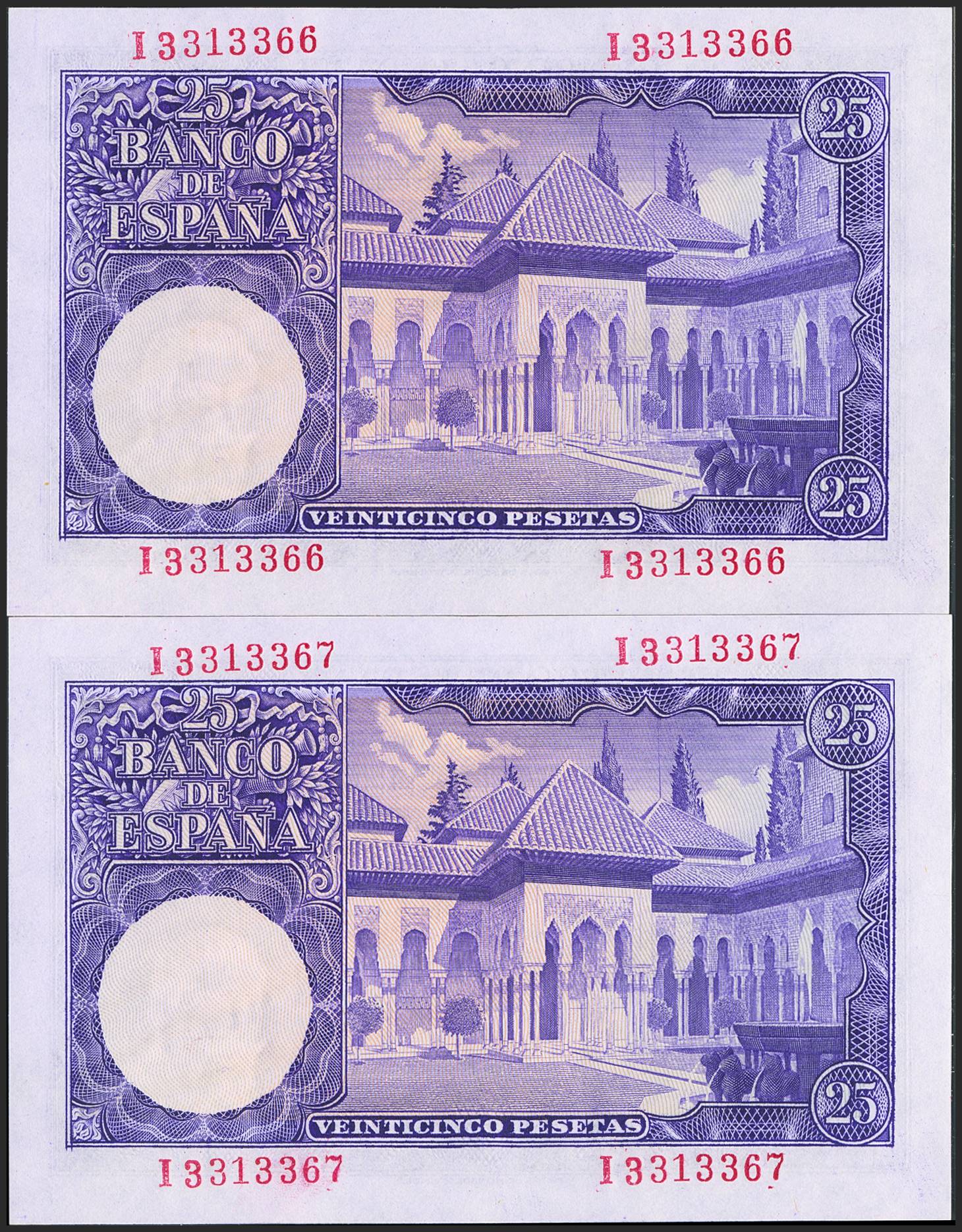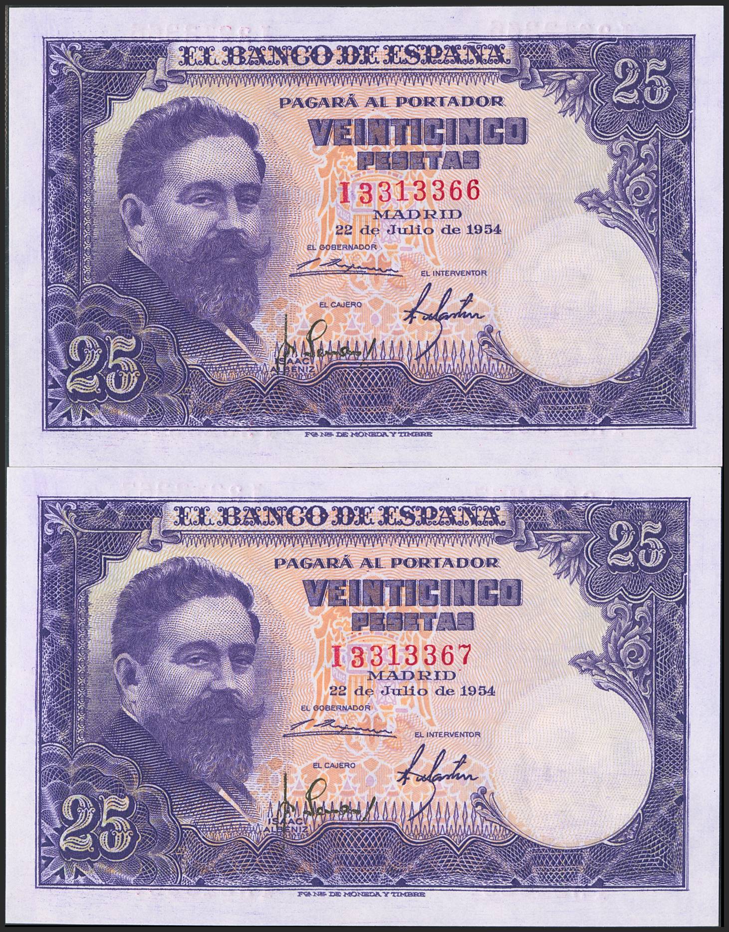 25 Pesetas. 22 de Julio de 1954. Pareja correlativa. Serie I. (Edifil 2023: 467a). Apresto original. SC.