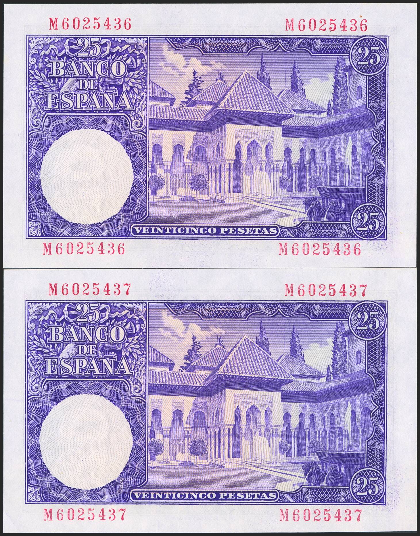 25 Pesetas. 22 de Julio de 1954. Pareja correlativa. Serie M. (Edifil 2023: 467a). Apresto original. SC/SC-.