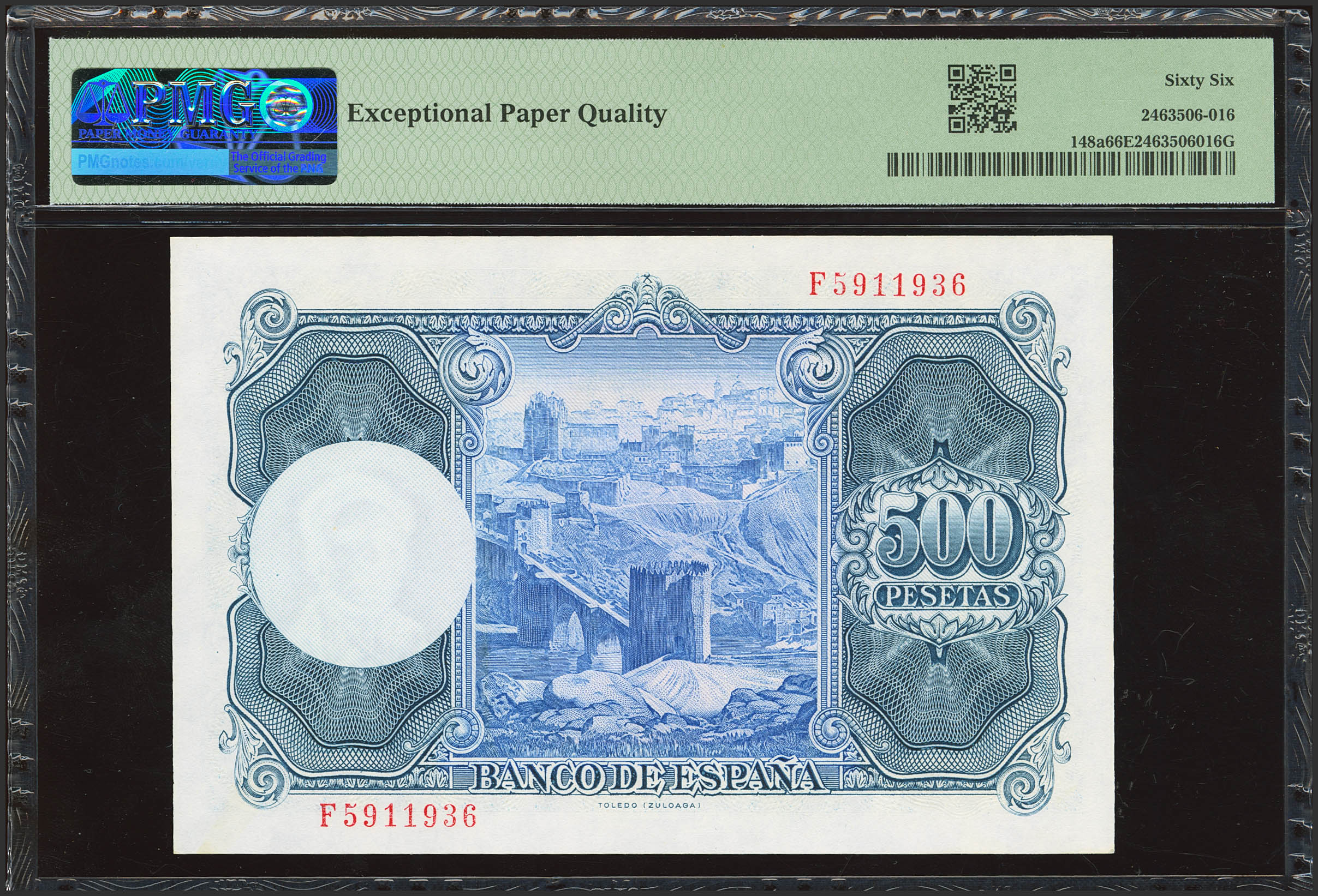 500 Pesetas. 22 de Julio de 1954. Serie F (Edifil 2023: 468b, Pick: 148a). Raro en esta excepcional calidad, apresto original. SC. Encapsulado PMG66EPQ.
