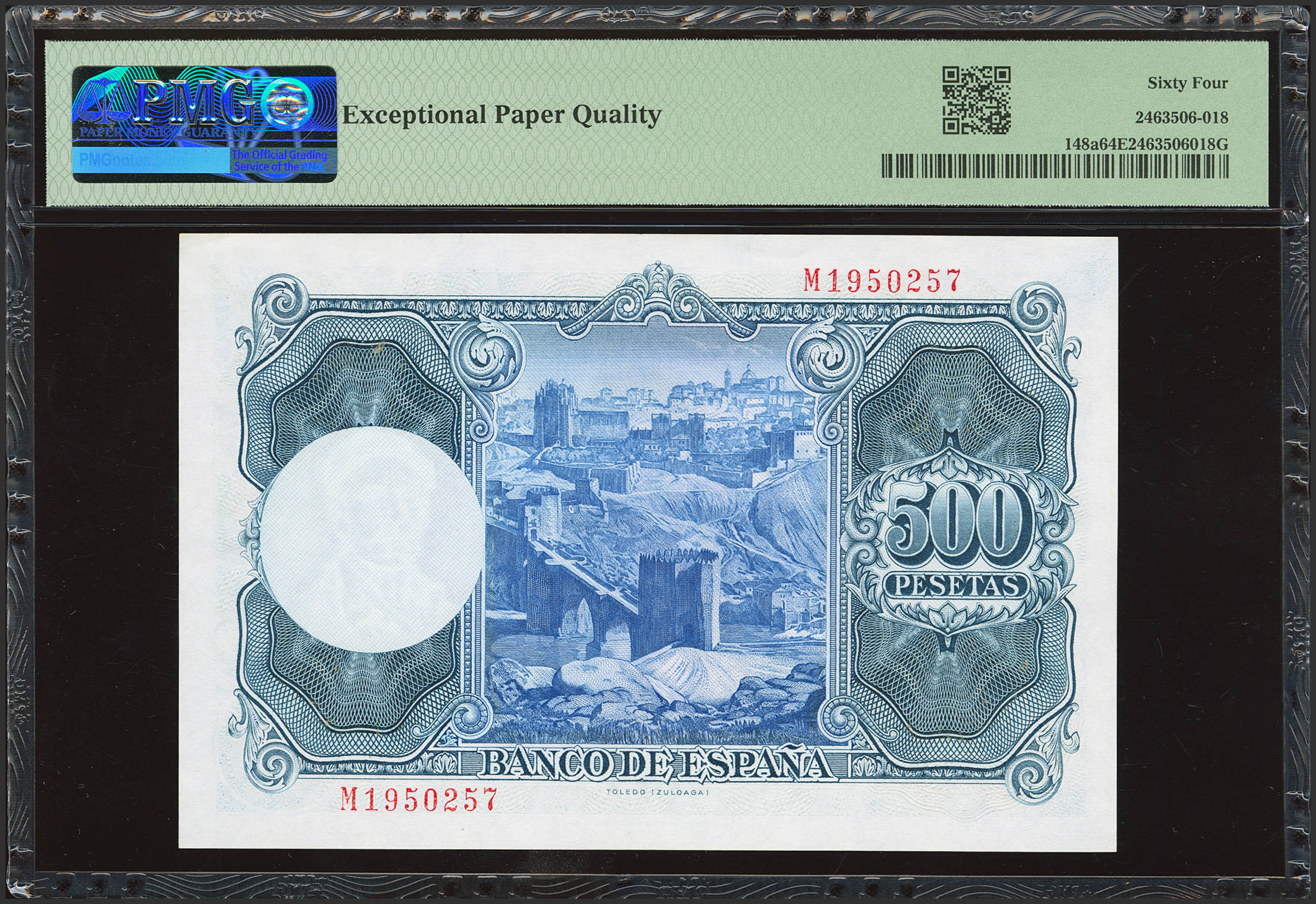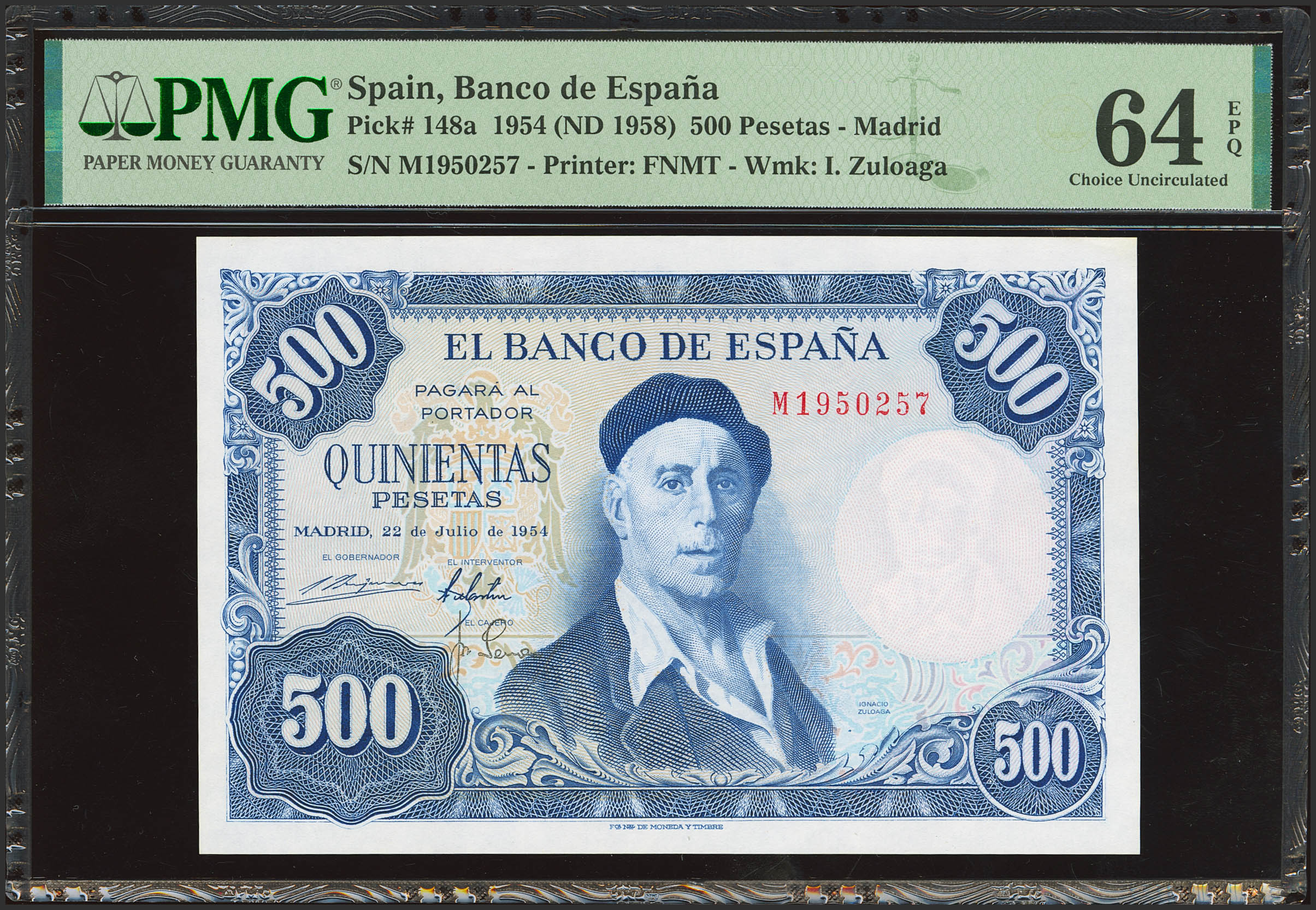 500 Pesetas. 22 de Julio de 1954. Serie M. (Edifil 2023: 468b, Pick: 148a). Inusual en esta excepcional calidad, apresto original. SC. Encapsulado PMG64EPQ.