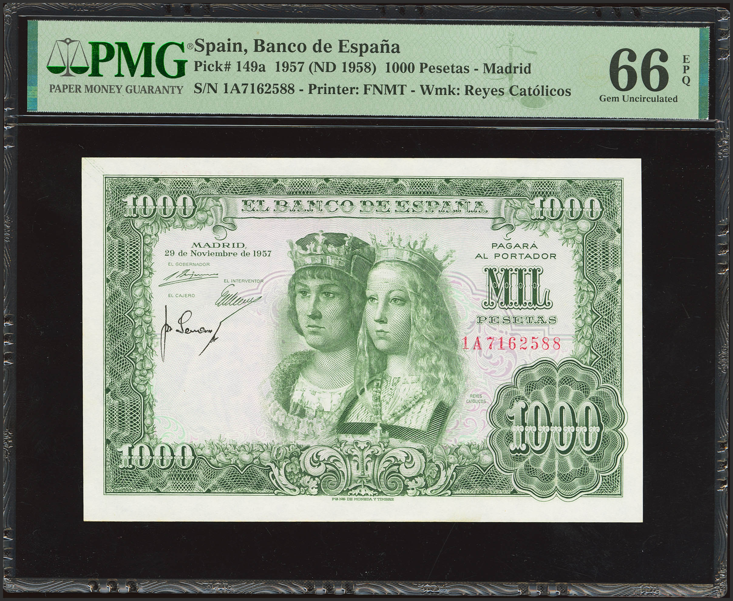1000 Pesetas. 29 de Noviembre de 1957. Serie 1A y firma calcada en el reverso. (Edifil 2023: 469b, Pick: 149a). Rarísimo especialmente en esta excepcional calidad, apresto original. SC. Encapsulado PMG66EPQ.