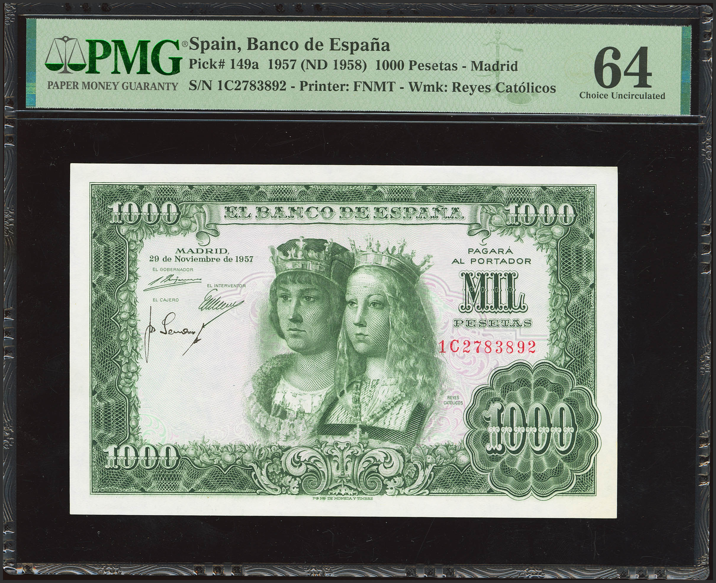 1000 Pesetas. 29 de Noviembre de 1957. Serie 1C. (Edifil 2023: 469b, Pick: 149a). SC. Encapsulado PMG64.