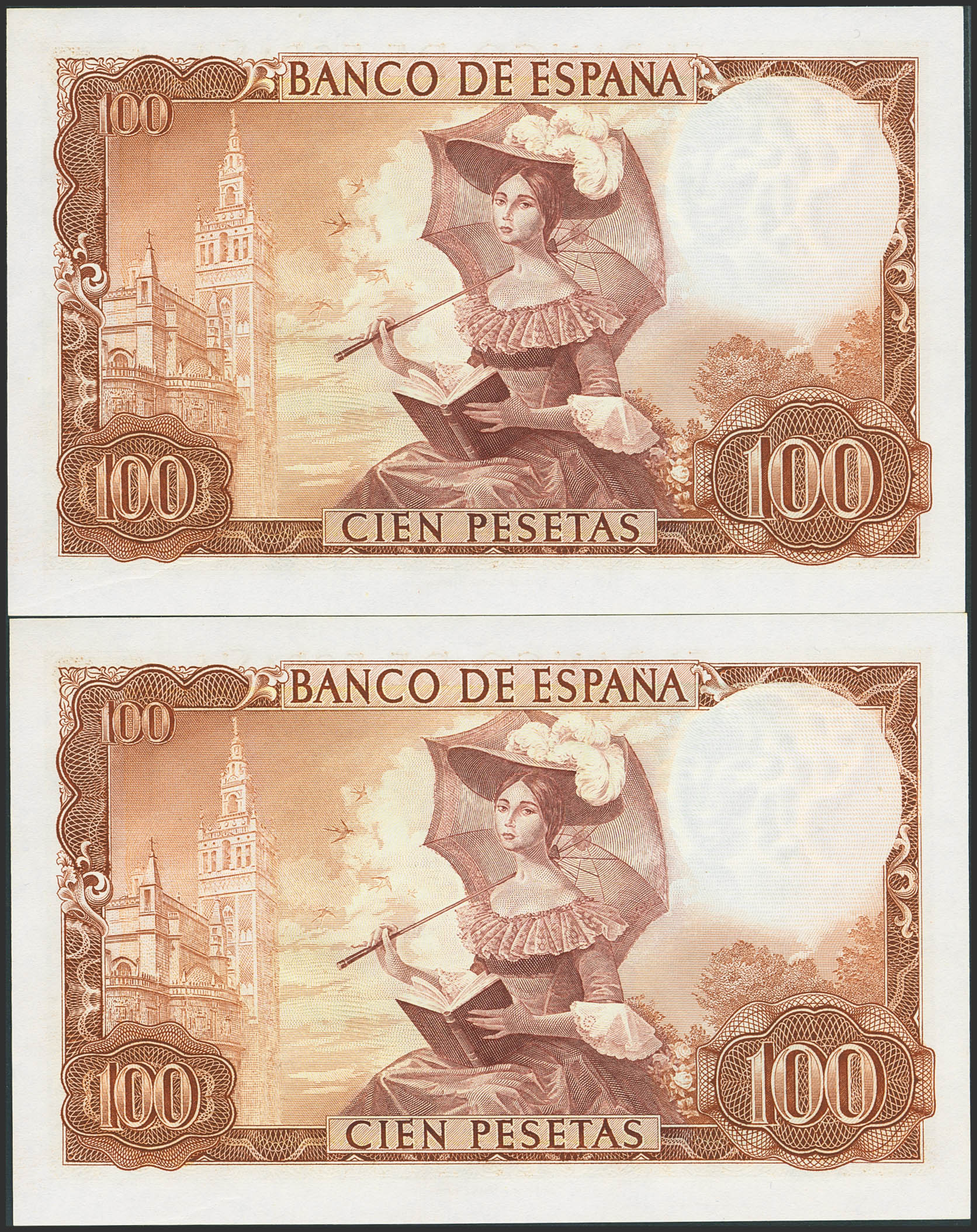 100 Pesetas. 19 de Noviembre de 1965. Pareja correlativa. Serie A. (Edifil 2021: 470a). Conserva todo su apresto original. SC.