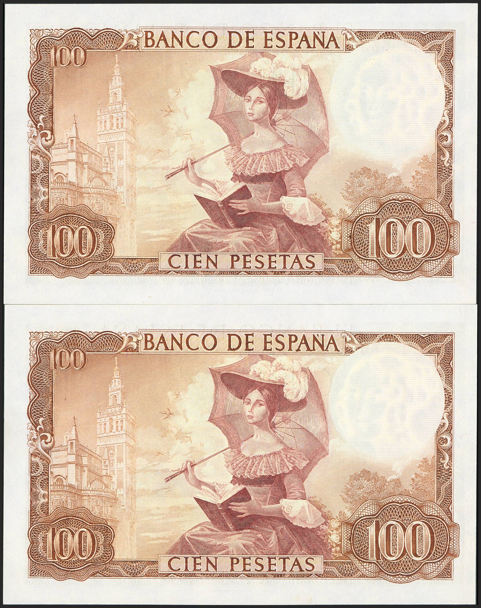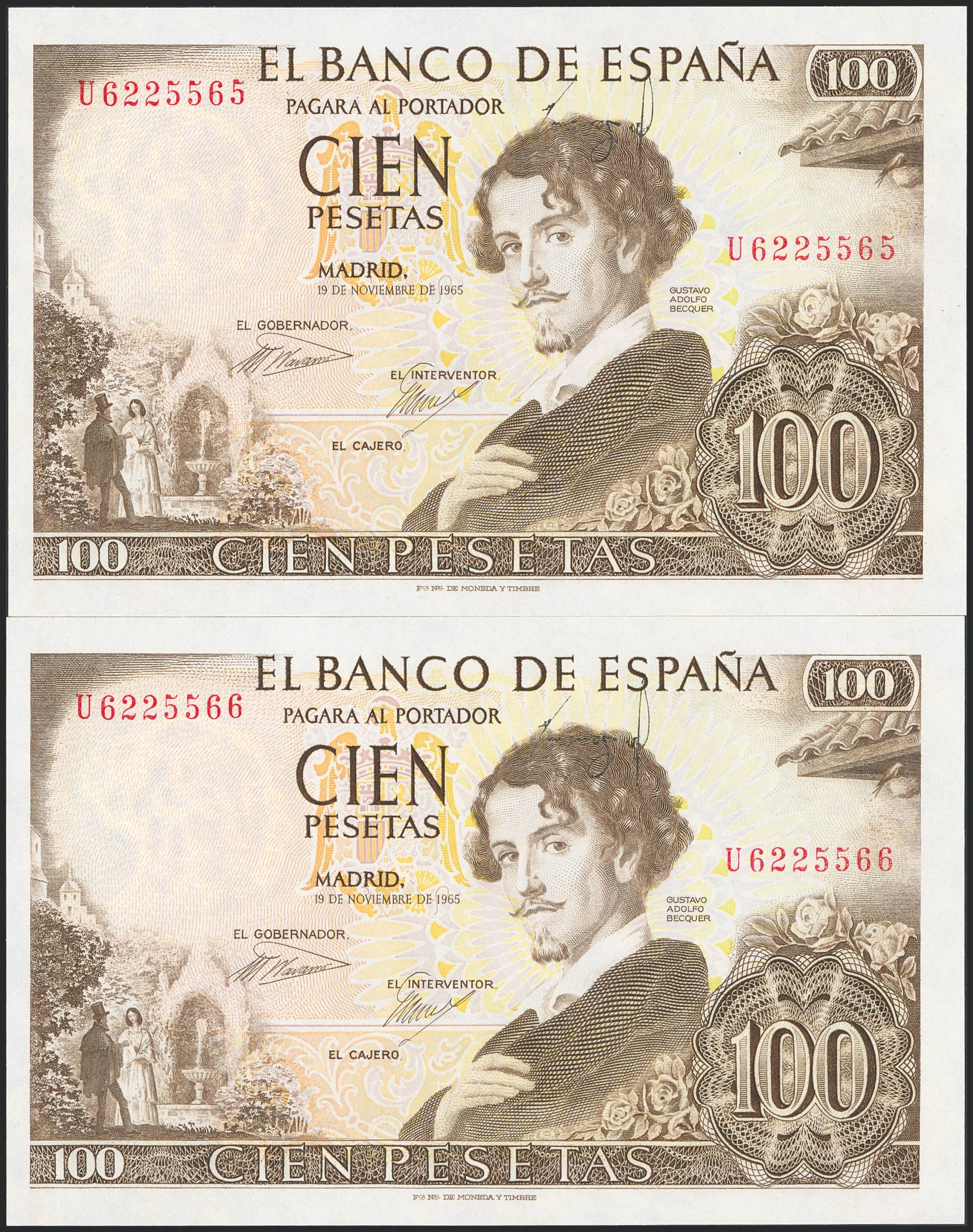 100 Pesetas. 19 de Noviembre de 1965. Pareja correlativa. Error en la firma del cajero invertida y desplazada. Serie U. (Edifil 2023: 470a). Conserva todo su apresto original, para entender mejor la contextualización de este billete recomendamos la obra "Enciclopedia de la Notafilia y Escripofilia Española", de Don José Antonio Castellanos. SC.