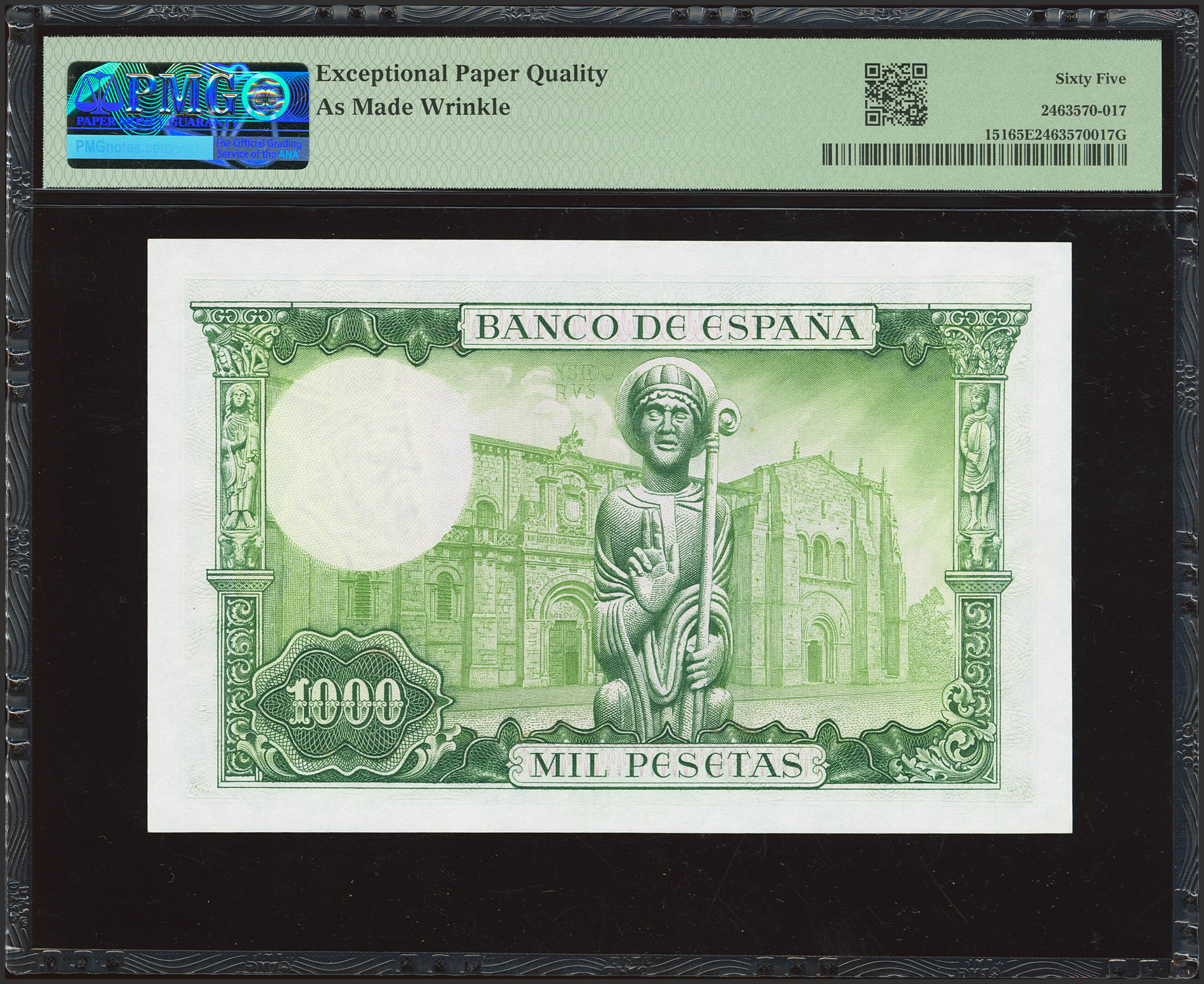 1000 Pesetas. 19 de Noviembre de 1965. Serie A. (Edifil 2023: 471a, Pick: 151). Rara serie, especialmente en esta excepcional calidad, apresto original. SC. Encapsulado PMG65EPQ.