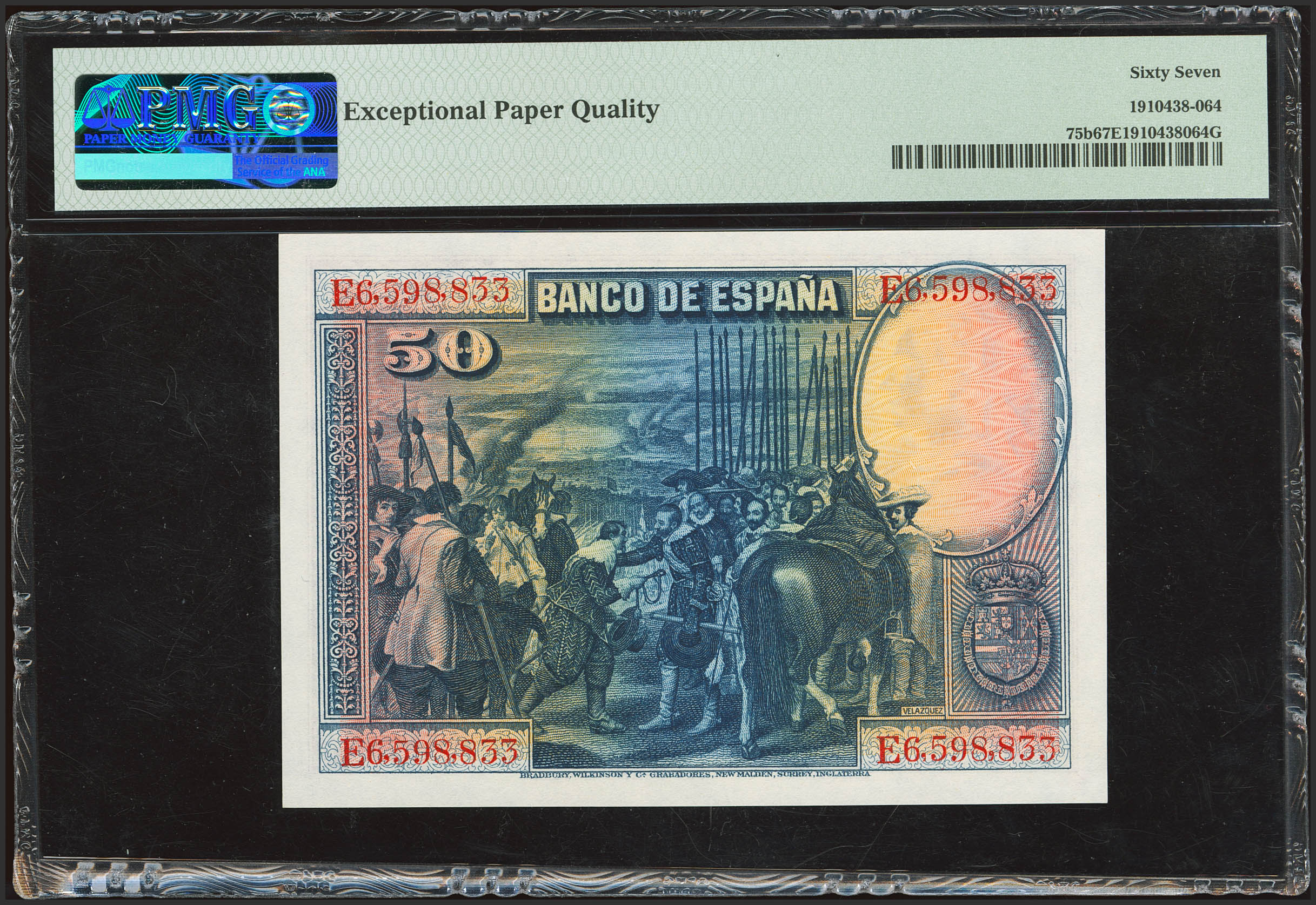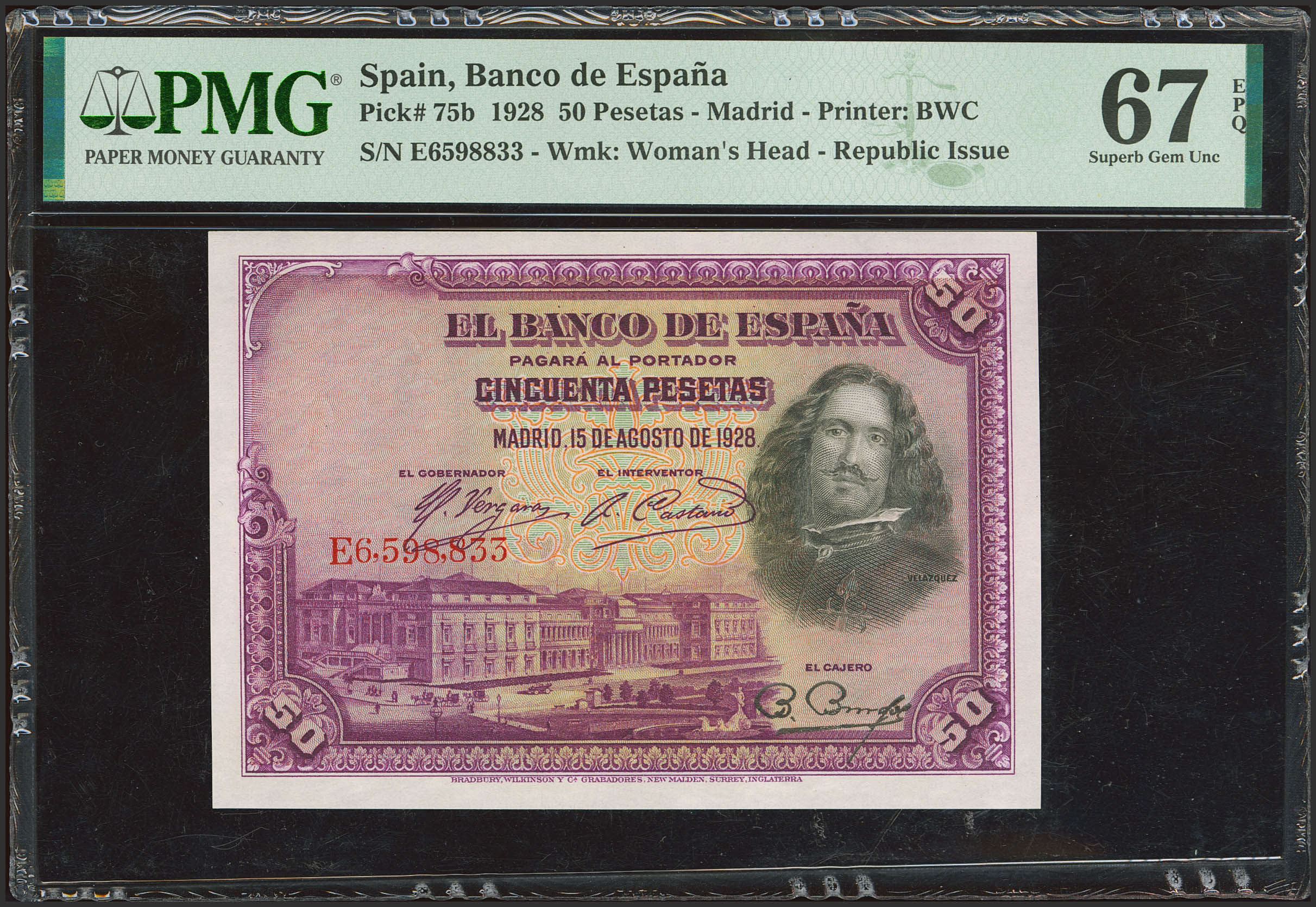 50 Pesetas. 15 de Agosto de 1928. Serie E. (Edifil 2023: 354, Pick: 75b). Apresto original. SC. Encapsulado PMG67EPQ.