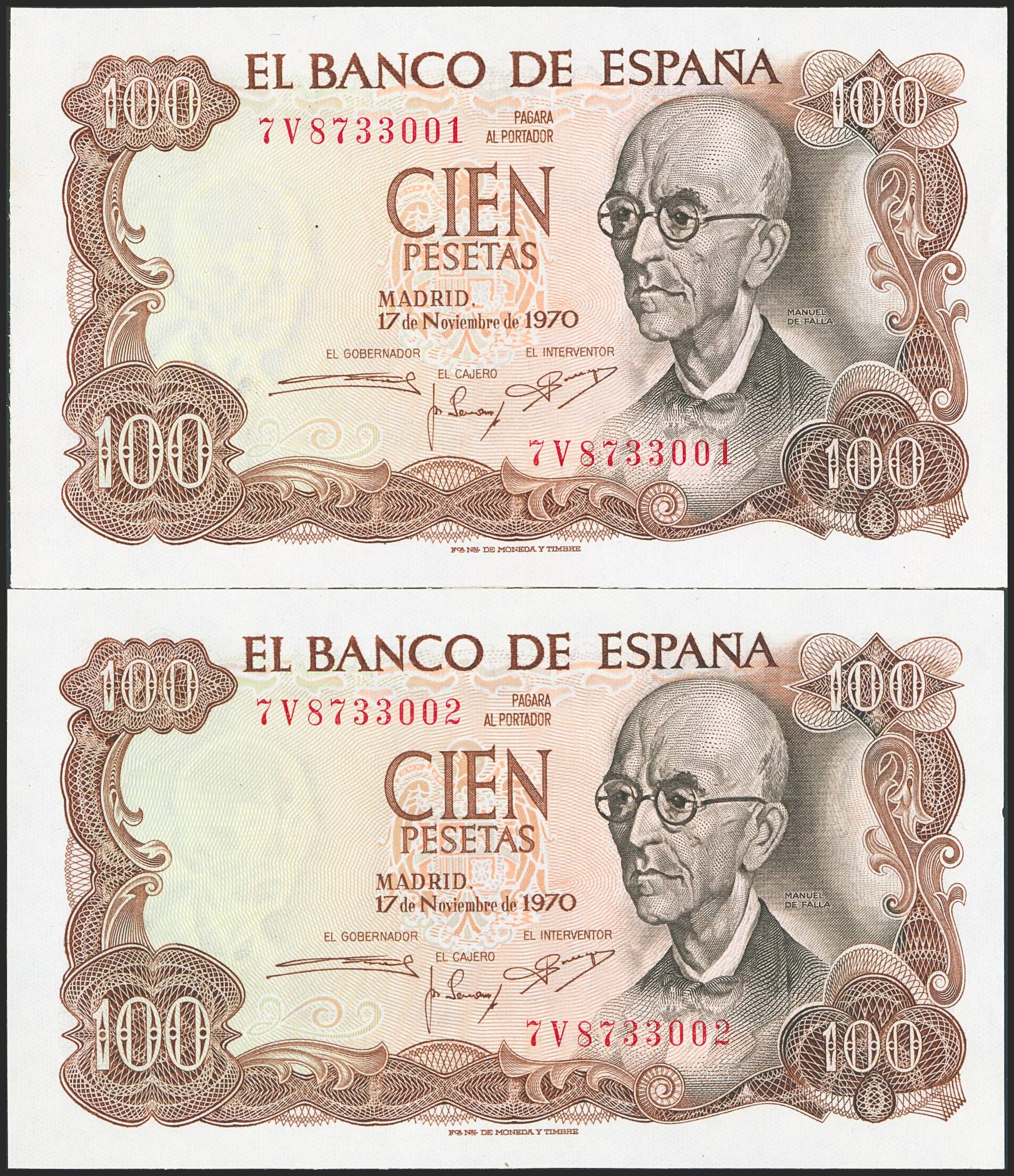100 Pesetas. 17 de Noviembre de 1970. Pareja correlativa. Serie 7V. (Edifil 2023: 472b). Apresto original. SC.