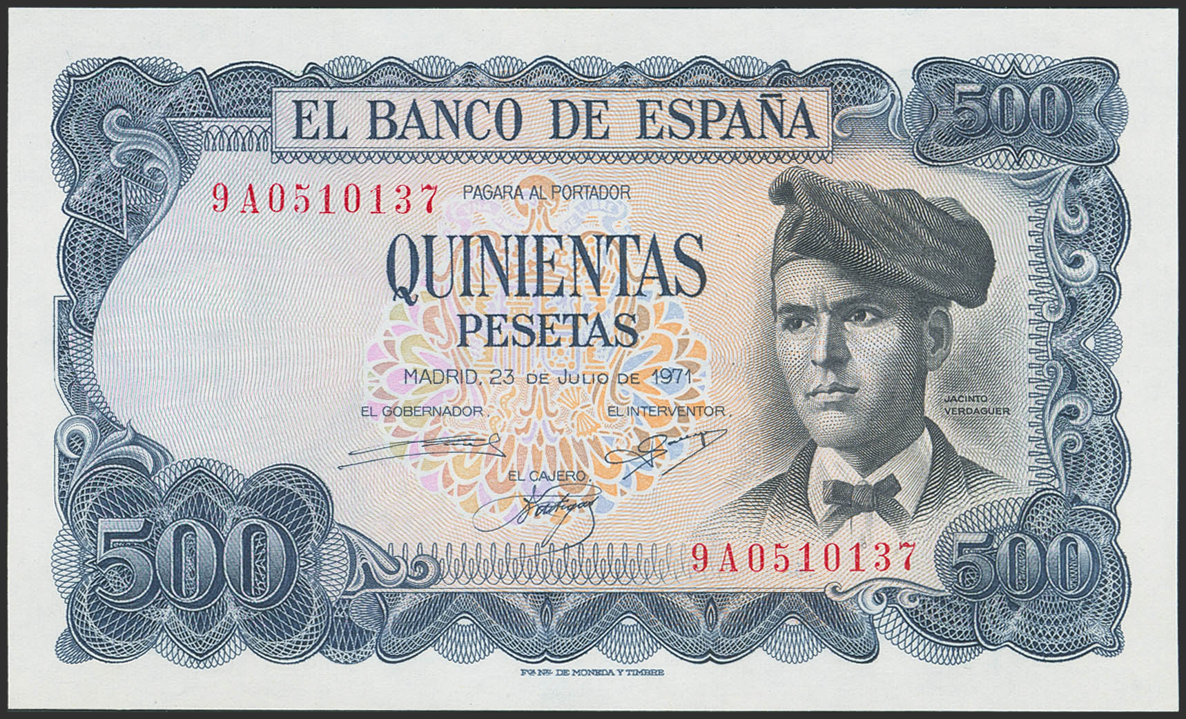 500 Pesetas. 23 de Julio de 1971. Serie especial 9A. (Edifil 2023: 473b). Apresto original. SC.