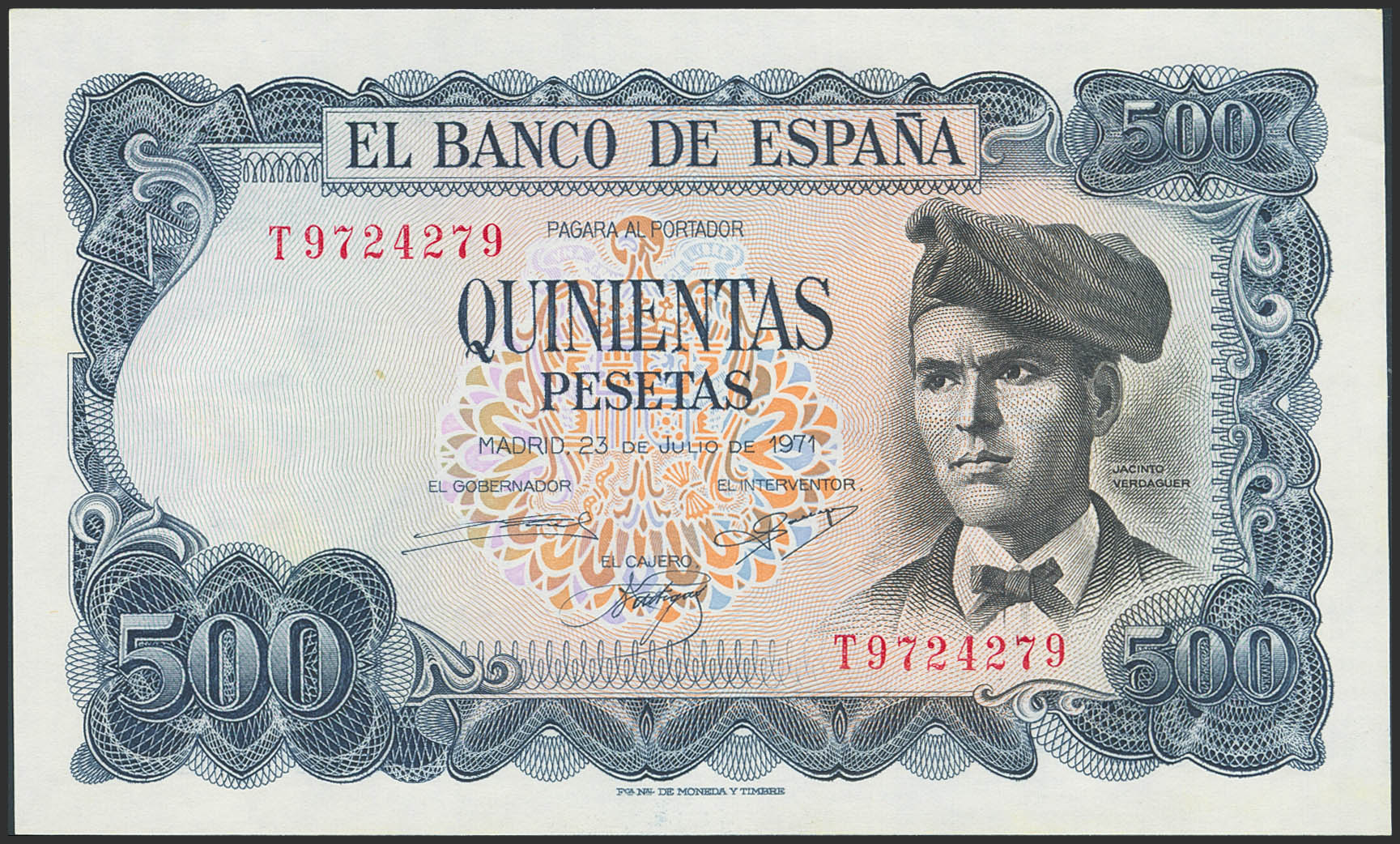 500 Pesetas. 23 de Julio de 1971. Serie T y numeración capicúa (Nº9724279). (Edifil 2023: 473a). Apresto original. EBC+++.