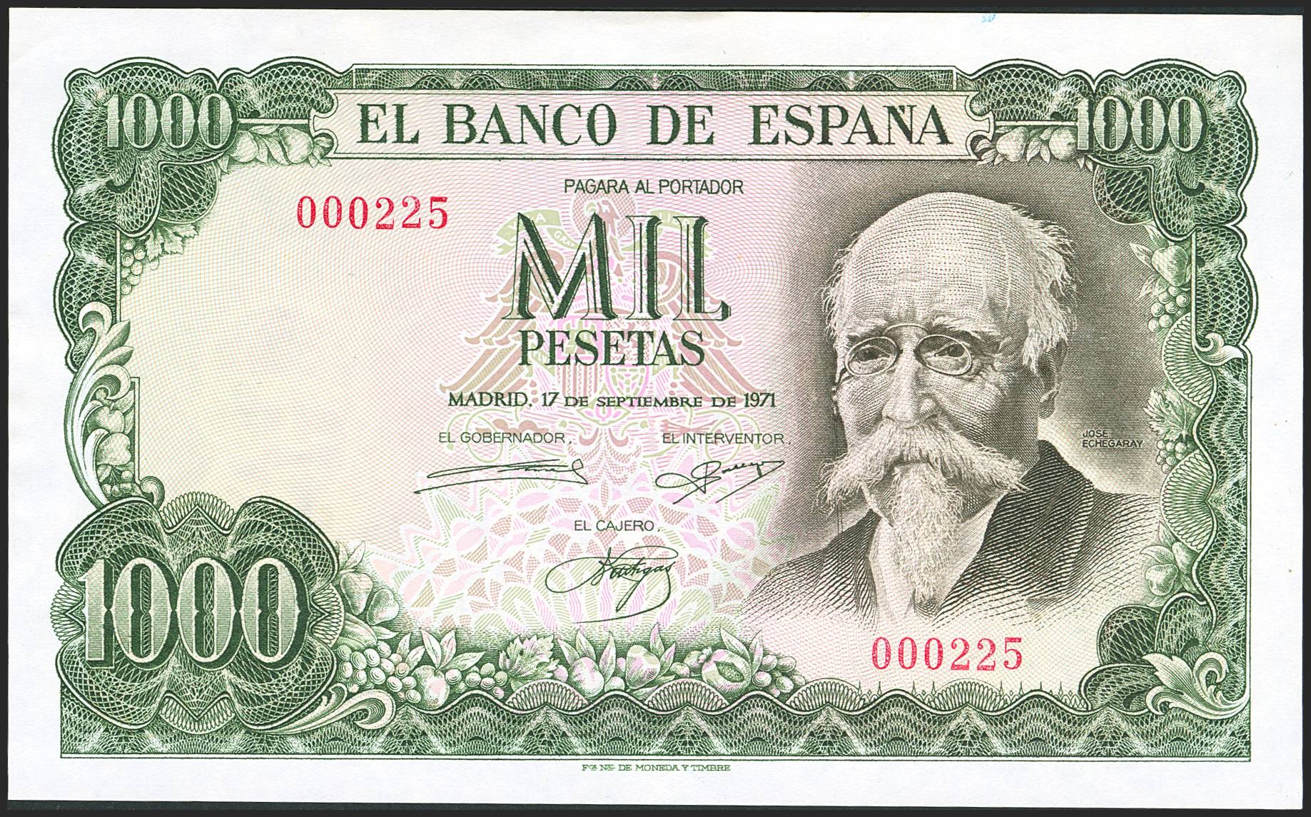 1000 Pesetas. 17 de Septiembre de 1971. Sin serie y numeración bajísima (Nº000225). (Edifil 2023: 474). SC-.