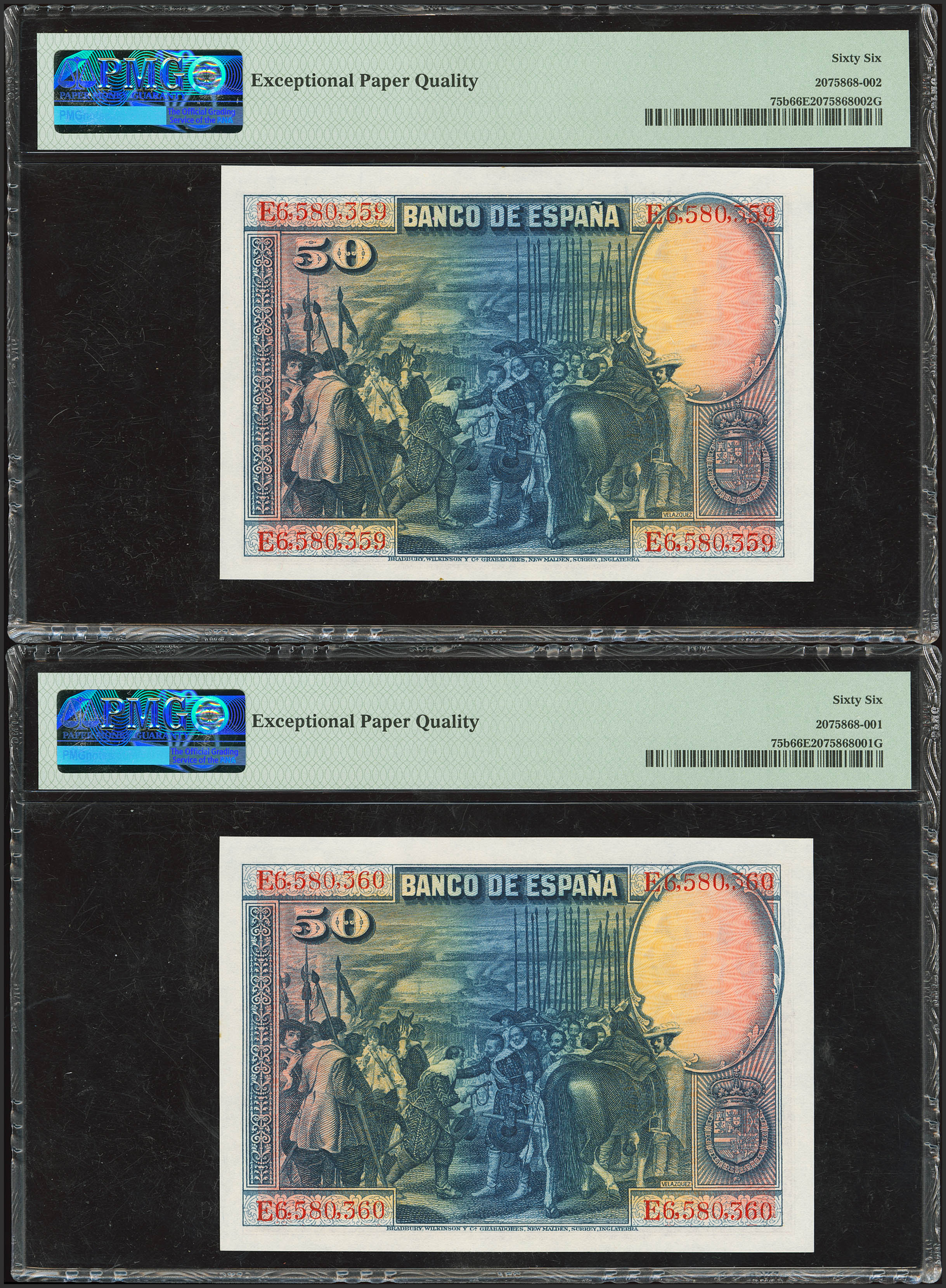 50 Pesetas. 15 de Agosto de 1925. Pareja correlativa. Serie E, última serie emitida. (Edifil 2023: 354, Pick: 75b). Apresto original. SC. Encapsulados PMG66EPQ, ambos.