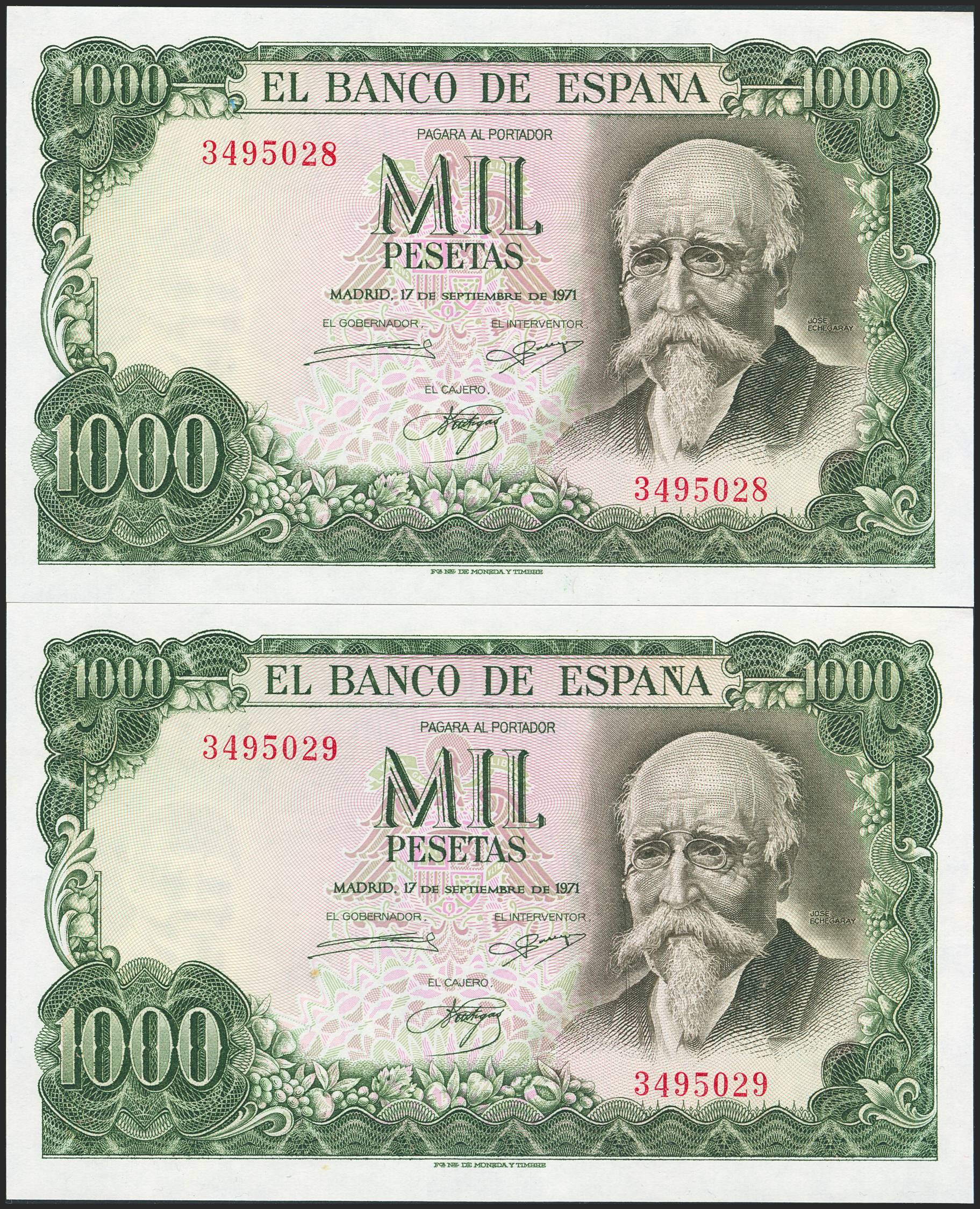 1000 Pesetas. 17 de Septiembre de 1971. Pareja correlativa. Sin serie. (Edifil 2023: 474). Apresto original. SC.