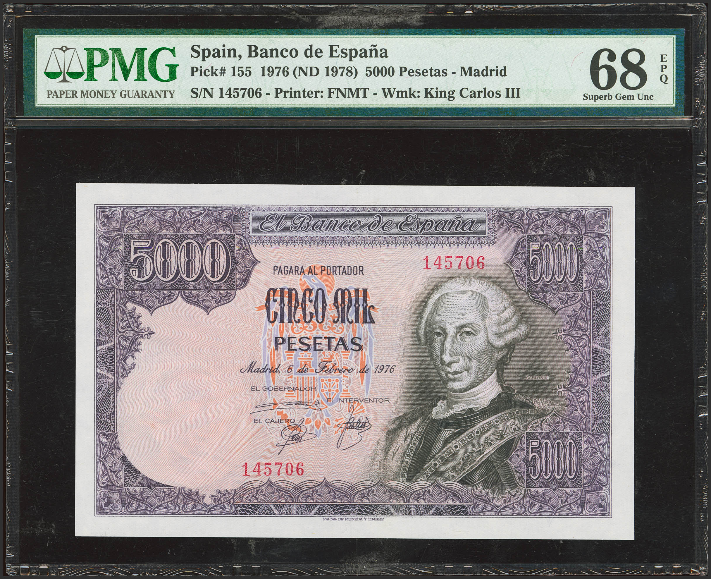 5000 Pesetas. 6 de Febrero de 1976. Sin serie. (Edifil 2023: 475, Pick: 155). SC. Encapsulado PMG68EPQ.